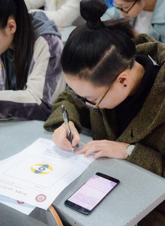 现场比赛精彩纷呈,有感染力的作品层出不穷,大家就像一个个沉淀已久的艺术家一样,在那张小小的比赛用纸上进行着灵感和美感的碰撞,行云流水,如大家挥毫。虽是同样的内容,但是每个人都写出了自己的个性和风格——绘有埃菲尔铁塔的法语散文、插有简约花边的西班牙诗歌、描有如云樱花的日语十九大金句……同学们用有限的篇幅最大限度地利用了自己的才能,透过潇洒干练的笔迹和奇思妙想的设计向全院师生献上了一幅又一幅优秀的作品!