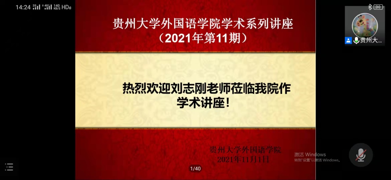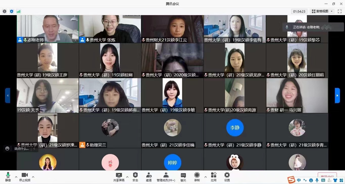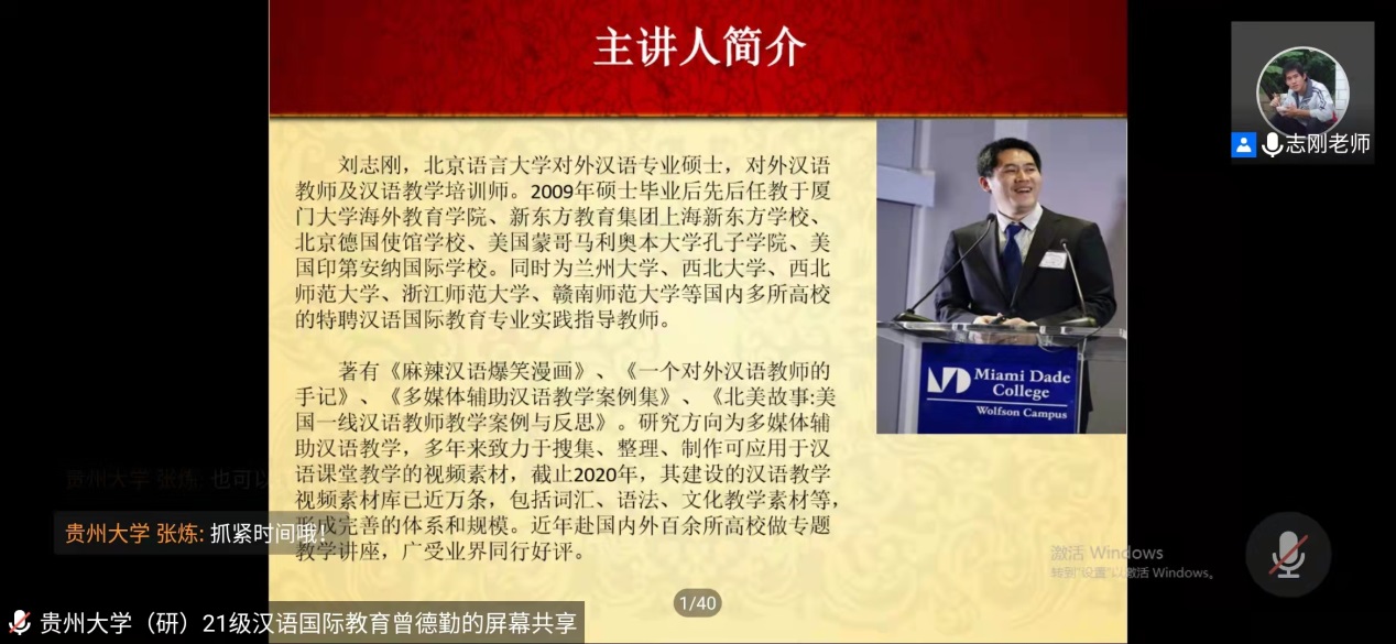 2021年11月1日中午12:30,由金沙9001cc以诚为本首页举办的2021年第11期学术系列讲座在云端顺利举行。本次讲座特邀北京语言大学对外汉语专业硕士,对外汉语教师及汉语教学培训师刘志刚老师作题为“对外汉语教师的核心竞争力和职业规划”的学术讲座。讲座由金沙9001cc以诚为本首页汉语国际教育硕士点主任张炼教授主持。金沙9001cc以诚为本首页百余名师生聆听讲座。