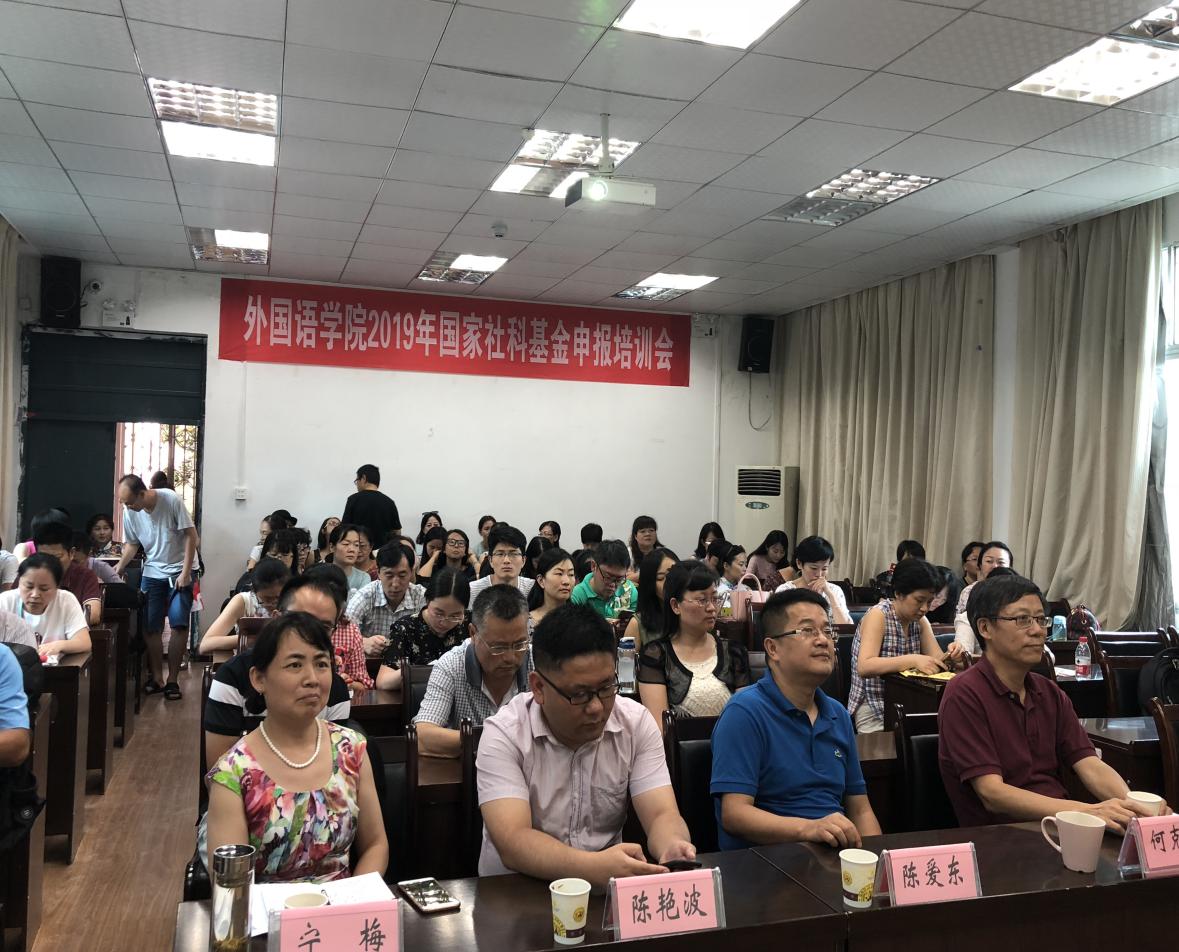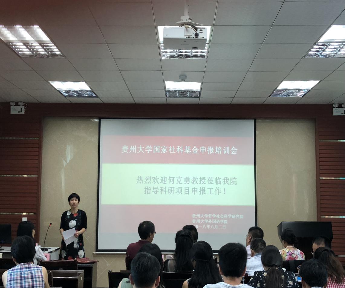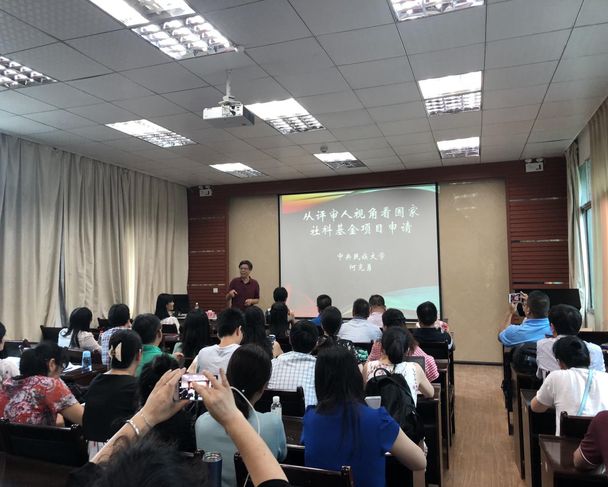 金沙9001cc以诚为本首页研究生科讯 8月2日下午,金沙官网在外语楼201报告厅召开教师科研能力提升暨2019年国家社科基金申报培训会,特邀中央民族大学金沙9001cc以诚为本首页博士生导师、国家社科基金评审专家何克勇教授作题为“从评审人视角看国家社科基金项目申请”的学术讲座与交流。哲学社会科学研究院副院长陈爱东,副院长陈艳波,金沙官网院长周杰,副院长宁梅,副院长王晓梅及学院80余名教师参加了本次培训会。