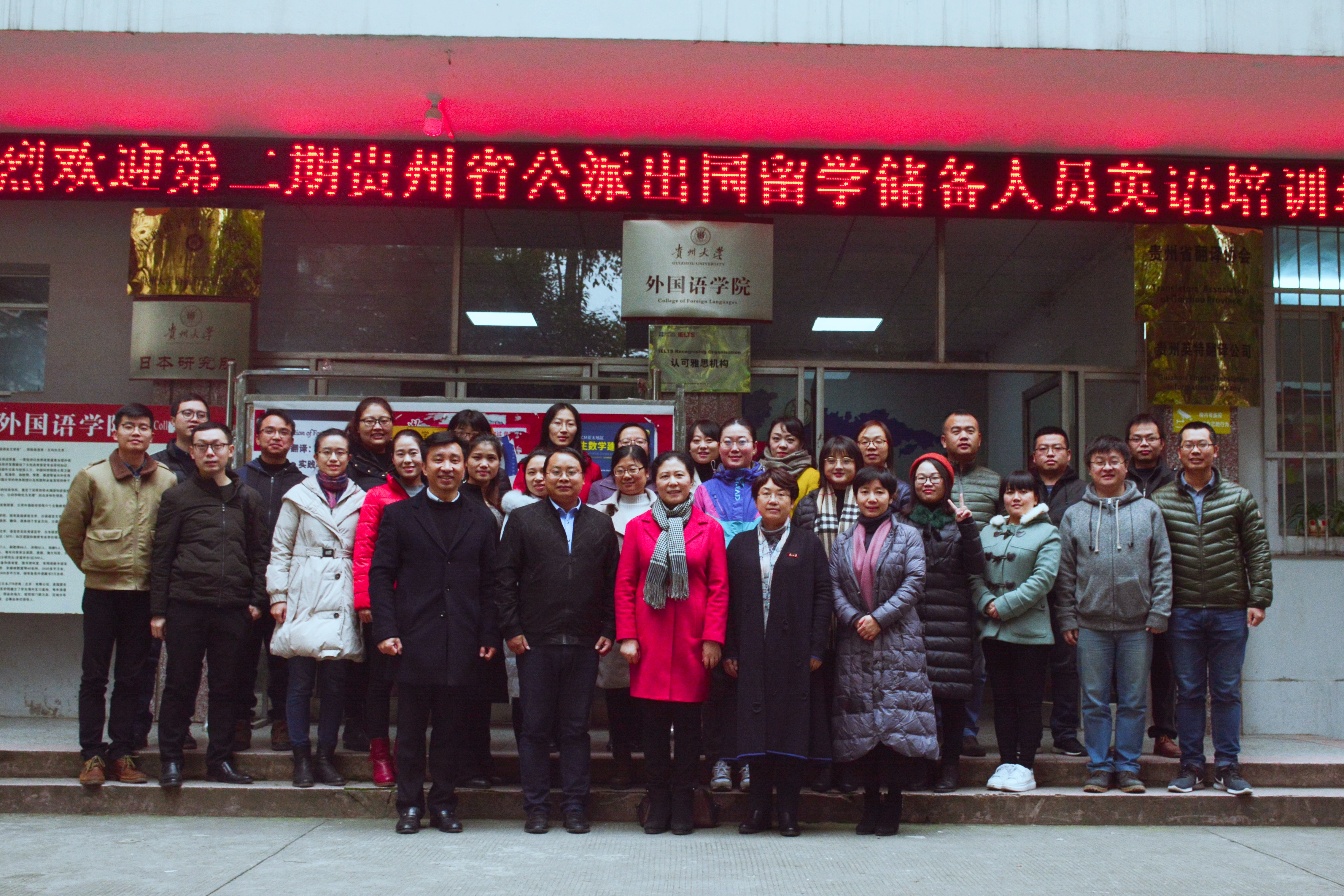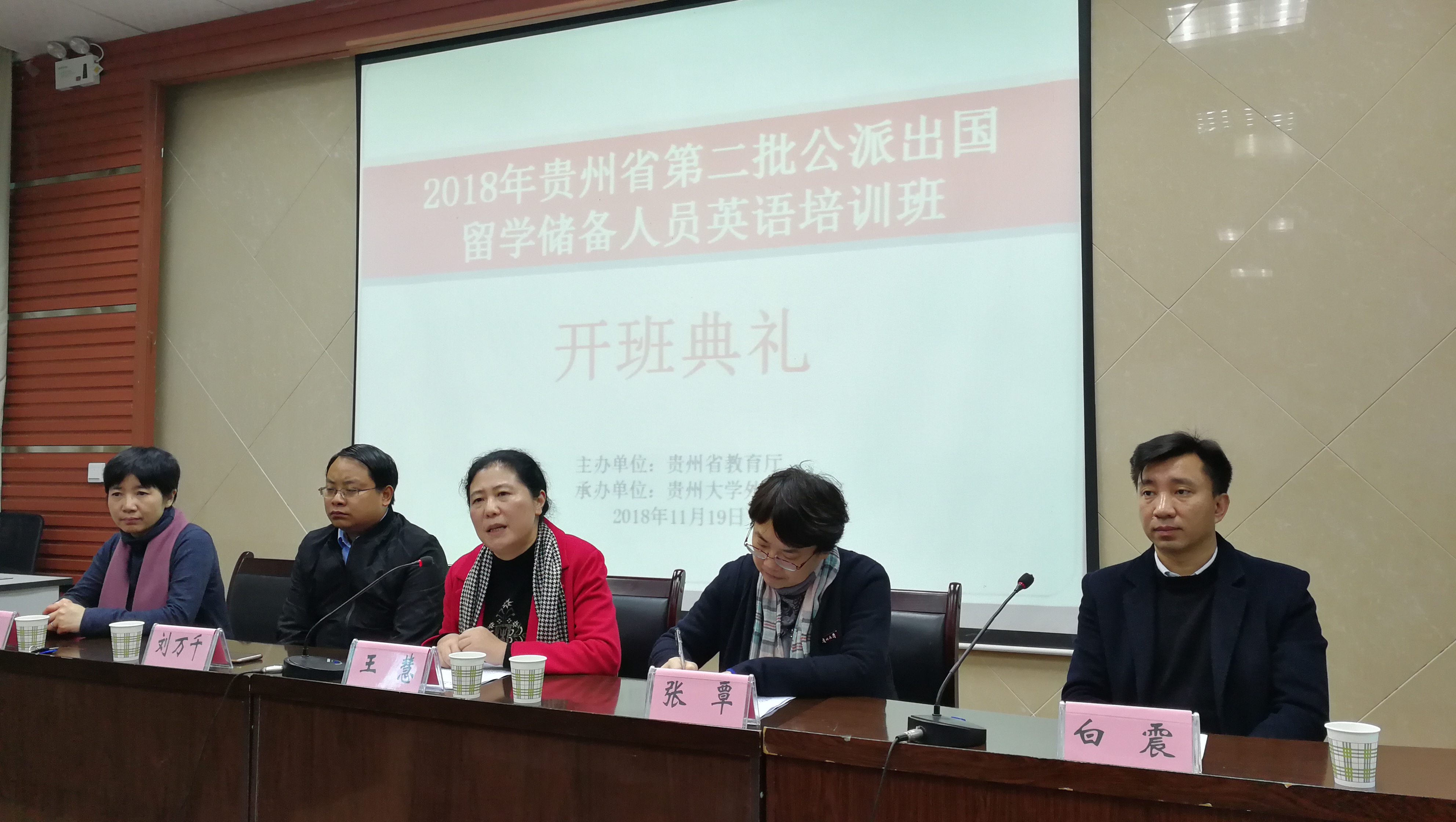 金沙9001cc以诚为本首页党政办讯 2018年11月19日上午9时,第二批贵州省公派出国留学储备人员英语培训班开班仪式在金沙官网201会议室举行。贵州省教育厅党组成员、贵州省教育工会主席王慧、金沙9001cc以诚为本首页副校长张覃、省教育厅国际交流与合作处负责人刘万千、金沙官网党委书记白震、院长周杰出席开班仪式。开班仪式由白震主持。