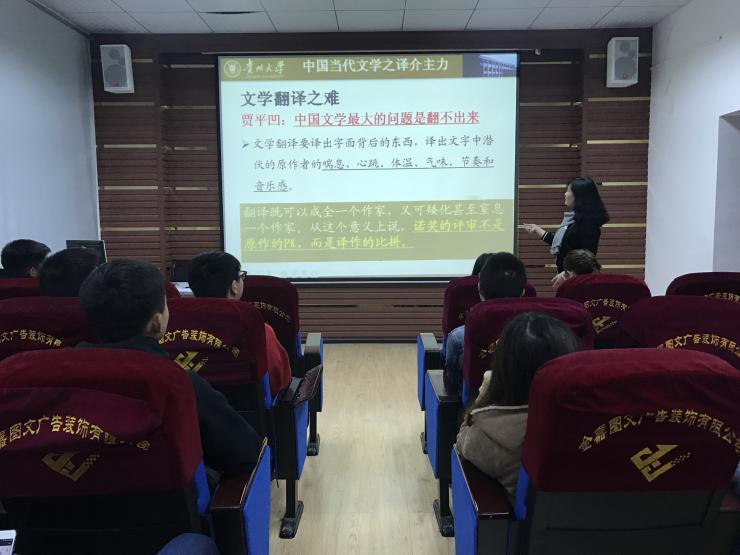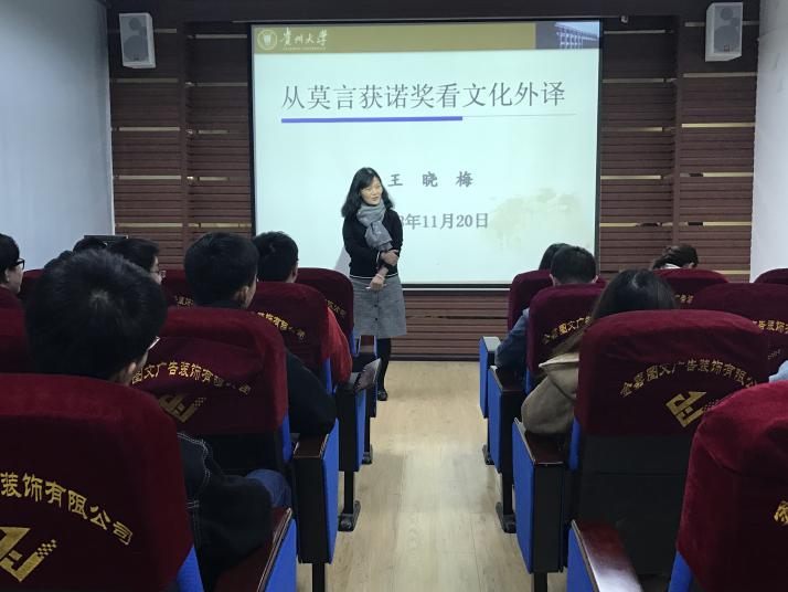 外语志愿者社团宣传部讯 11月20日下午,由金沙官网外语志愿者社团主办,副院长王晓梅主讲的“从莫言获诺奖看文化外译”主题讲座于外语楼122室举行。金沙官网院长周杰、翻译系副教授王晓敏出席讲座。