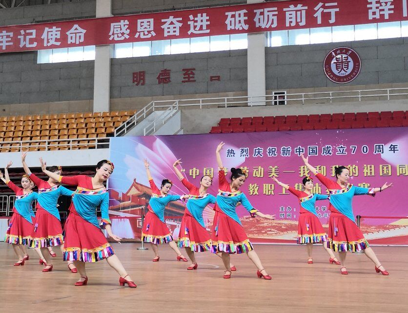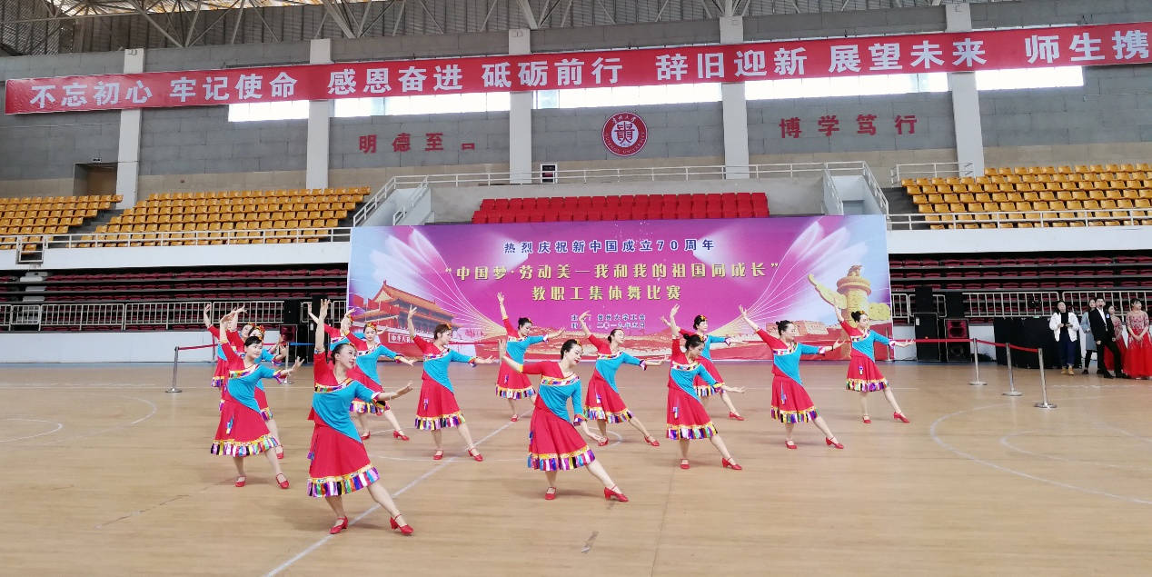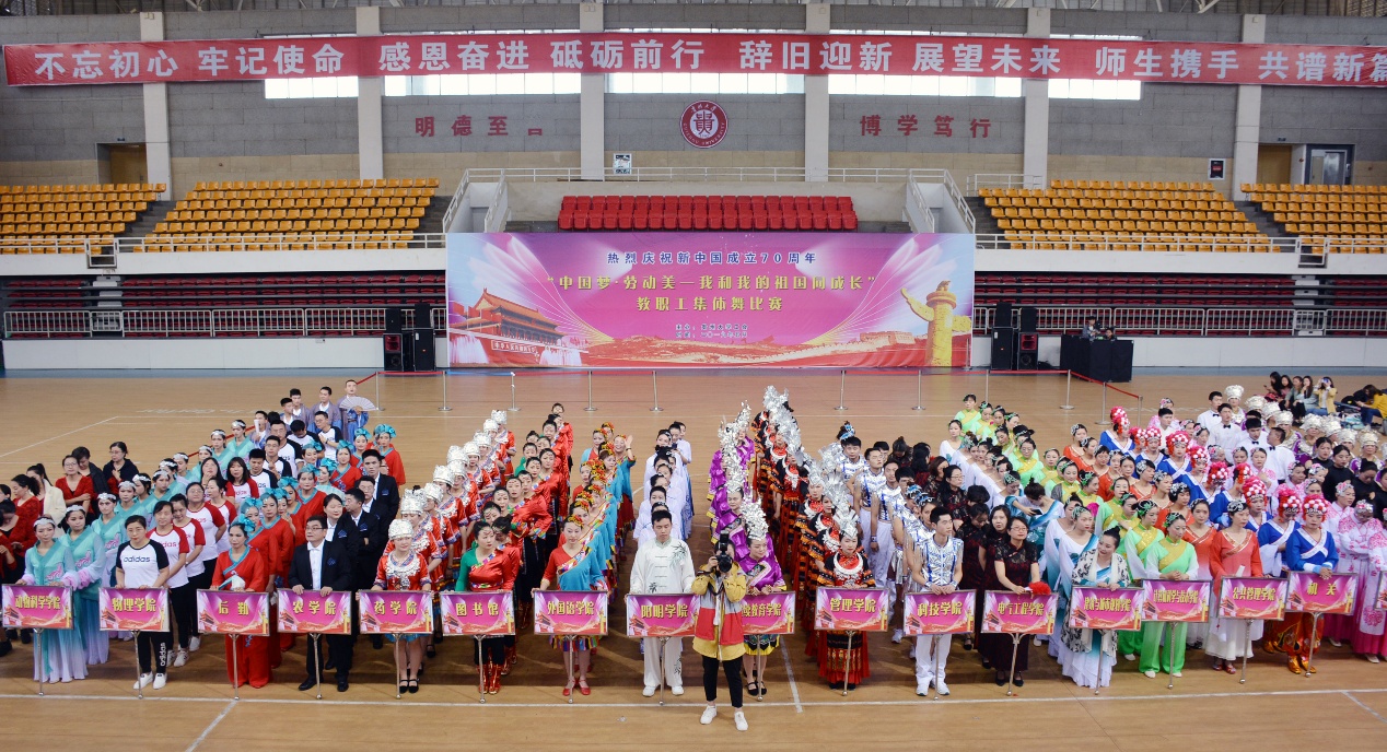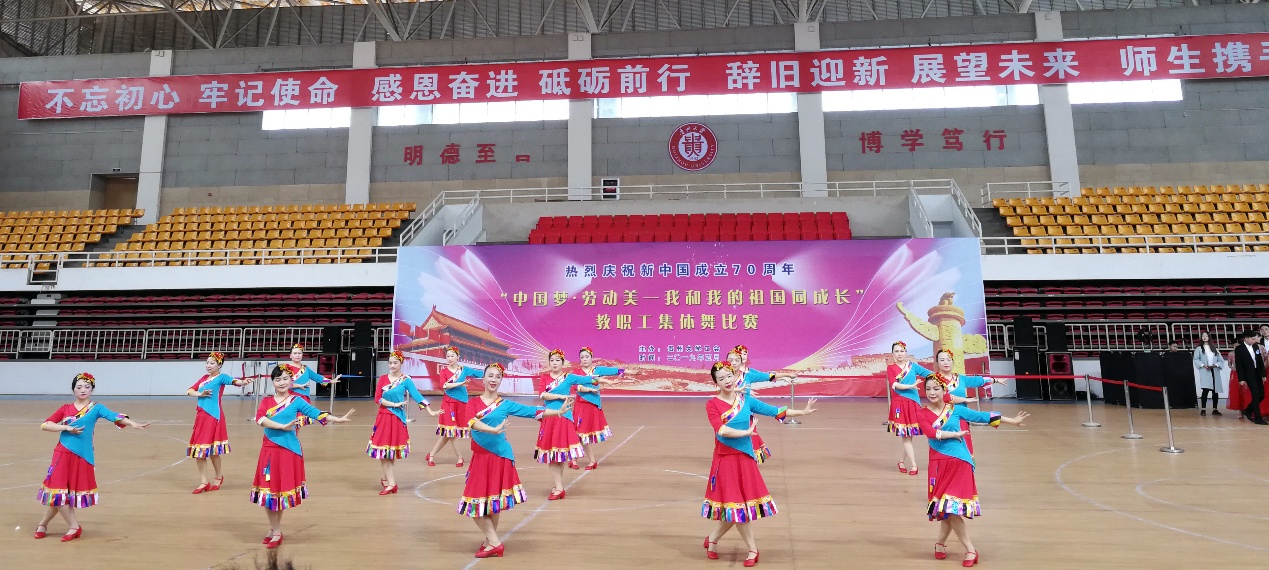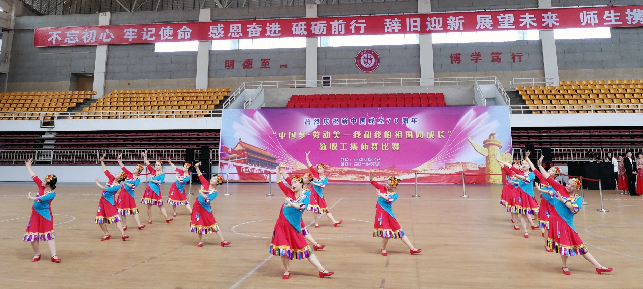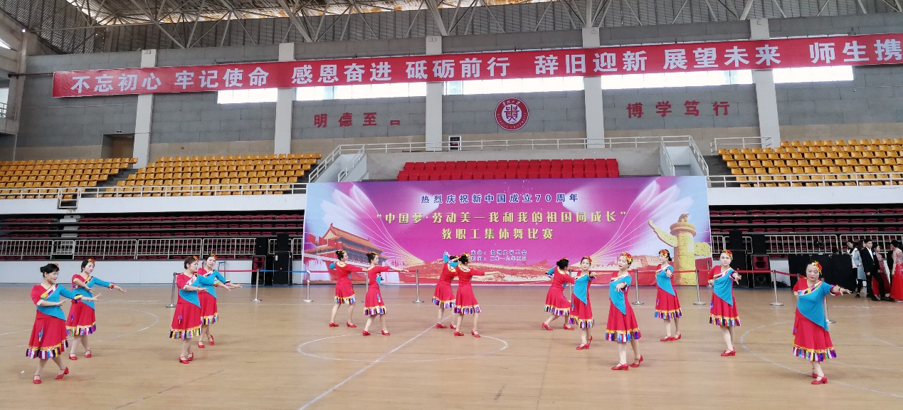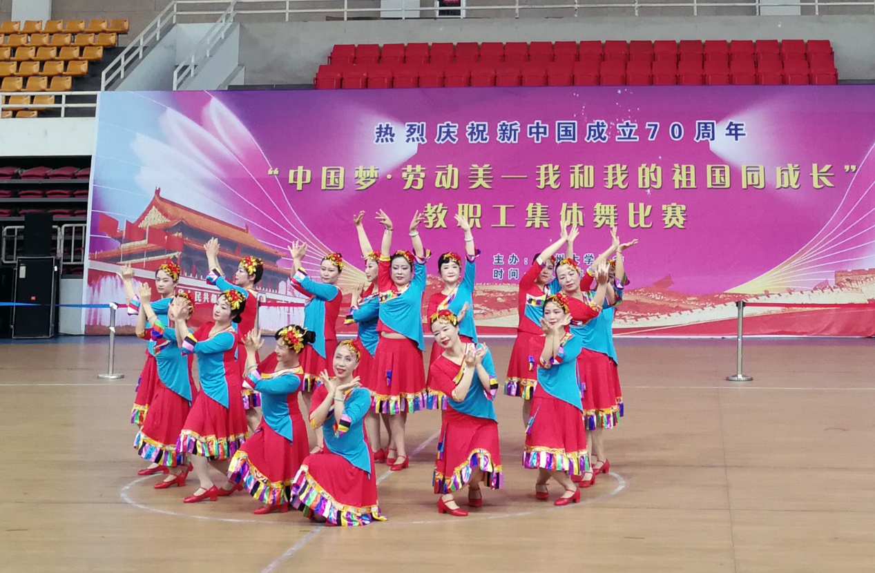 金沙9001cc以诚为本首页党政办讯 为热烈庆祝新中国成立70周年,5月10日,由金沙9001cc以诚为本首页工会主办的“中国梦•劳动美—我和我的祖国同成长”教职工集体舞比赛在金沙9001cc以诚为本首页东校区(原北校区)体育馆举行,金沙官网由15人组成的参赛队积极参加了此次集体舞比赛。