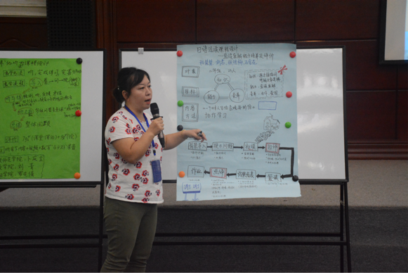 30日,全国41所高校的50余名青年骨干教师参加了以“新时期背景下的日语人才培养与课堂教学设计”为主题的工作坊。本次工作坊共分为五个班级,分别为基础日语班、听力与会话班、阅读与写作班、高级日语与翻译及其他专业课班、大学日语及旅游商贸日语班。在各位研修专家指导下,参加工作坊的老师们通过反思自己课堂的不足,组内研讨,设计形成教案,制作海报等环节,达到转变教学理念,提升教学设计能力和反思能力的效果。31日上午,在行政报告厅举行了各组教学设计的成果展示,推选出的六位代表还在大会上就本组的教学设计方案进行了汇报。林洪老师从追求课程核心价值、注重教材的分析和处理、合理安排课堂时间及提高有效教学等角度出发,对各组的课堂设计给予了中肯的点评。