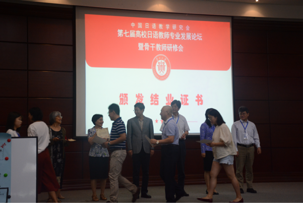 闭幕式由哈尔滨师范大学的王琪教授主持。周异夫教授、赵华敏教授、冷丽敏教授、毋育新教授、王崇梁老师、谷部弘子教授为全程参加工作坊的老师们颁发了《高校日语教师高级研修班结业证书》,其中陈建明老师、刘岩老师、金国敏老师作为本次研修会的教师代表进行了发言,陈建明老师表示,通过本次研修进一步加深了对一线教学重要性的理解,同时也将促进日语教学更加科学化、体系化。刘岩老师表示通过研修会专家和老师的讲解,清楚了自己该成为什么样的老师以及应该将学生培养成什么样的人,会将学到的知识运用到自己的教学实践中去。金国敏老师则表示,通过与专家、老师们的交流,让自己学到了更多的知识,期待着下一次的交流活动。