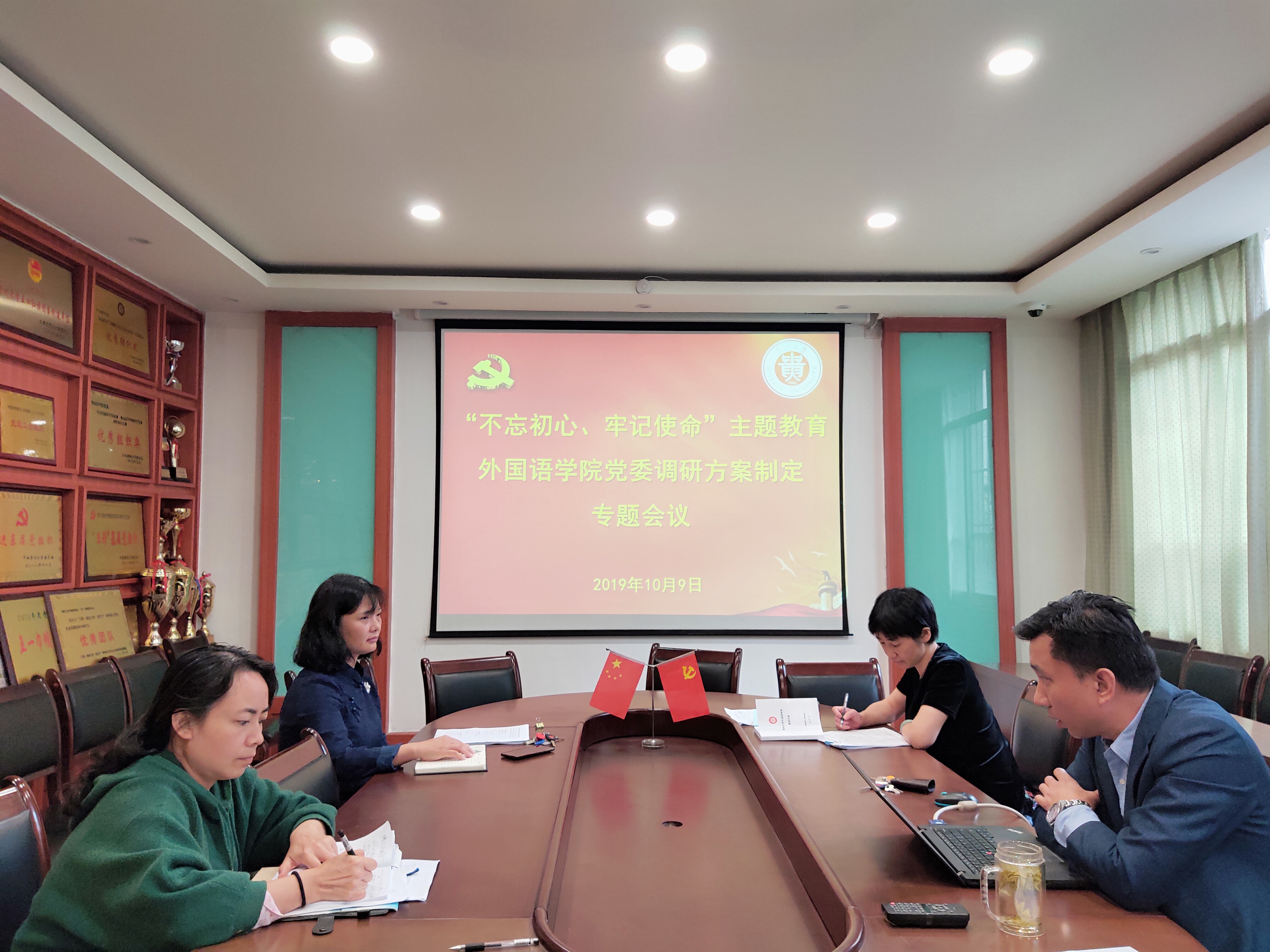 金沙9001cc以诚为本首页党政办讯 10月9日中午1时,金沙官网党委在外语楼207会议室召开“不忘初心、牢记使命”主题教育调研方案专题会议。学院党委书记白震、院长周杰、副院长宁梅、王晓梅参加会议。会议由白震书记主持。