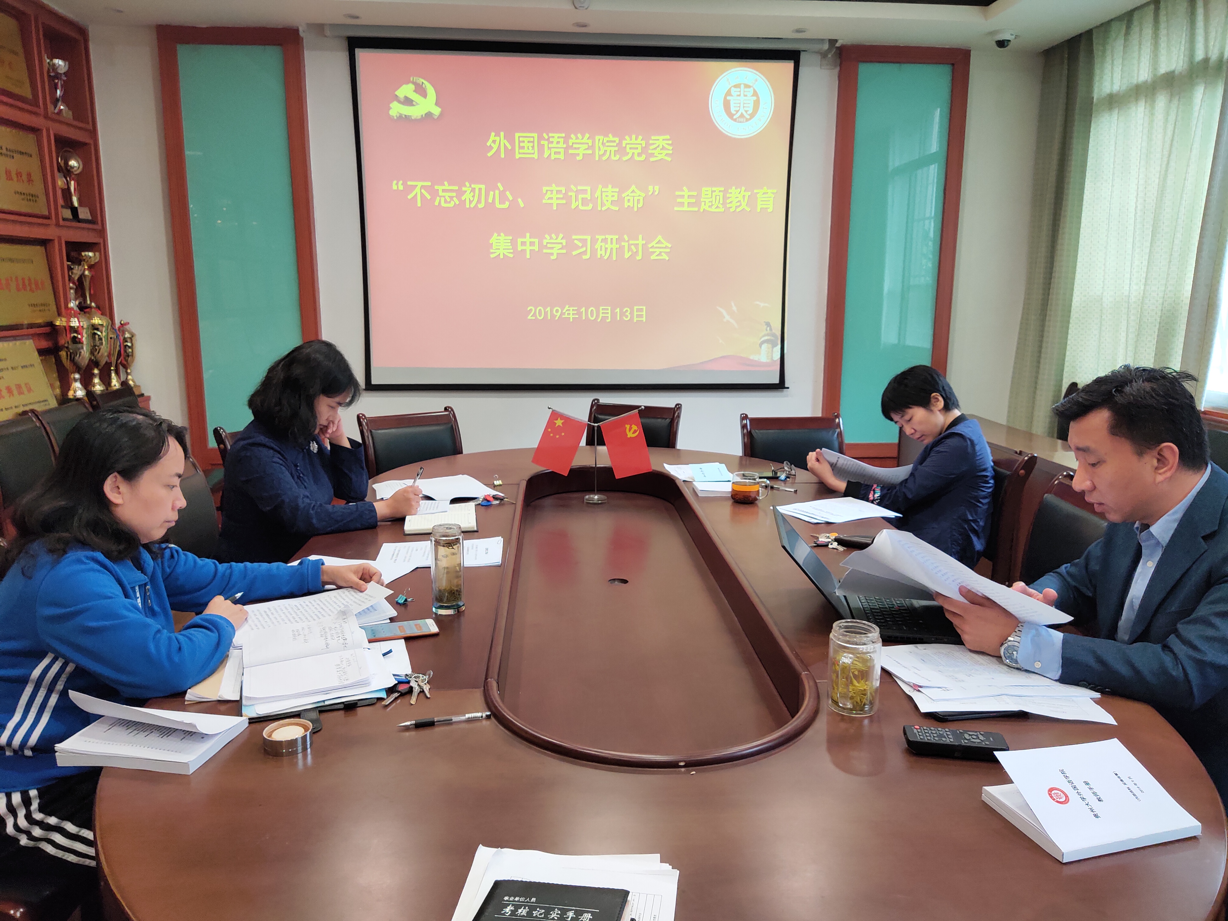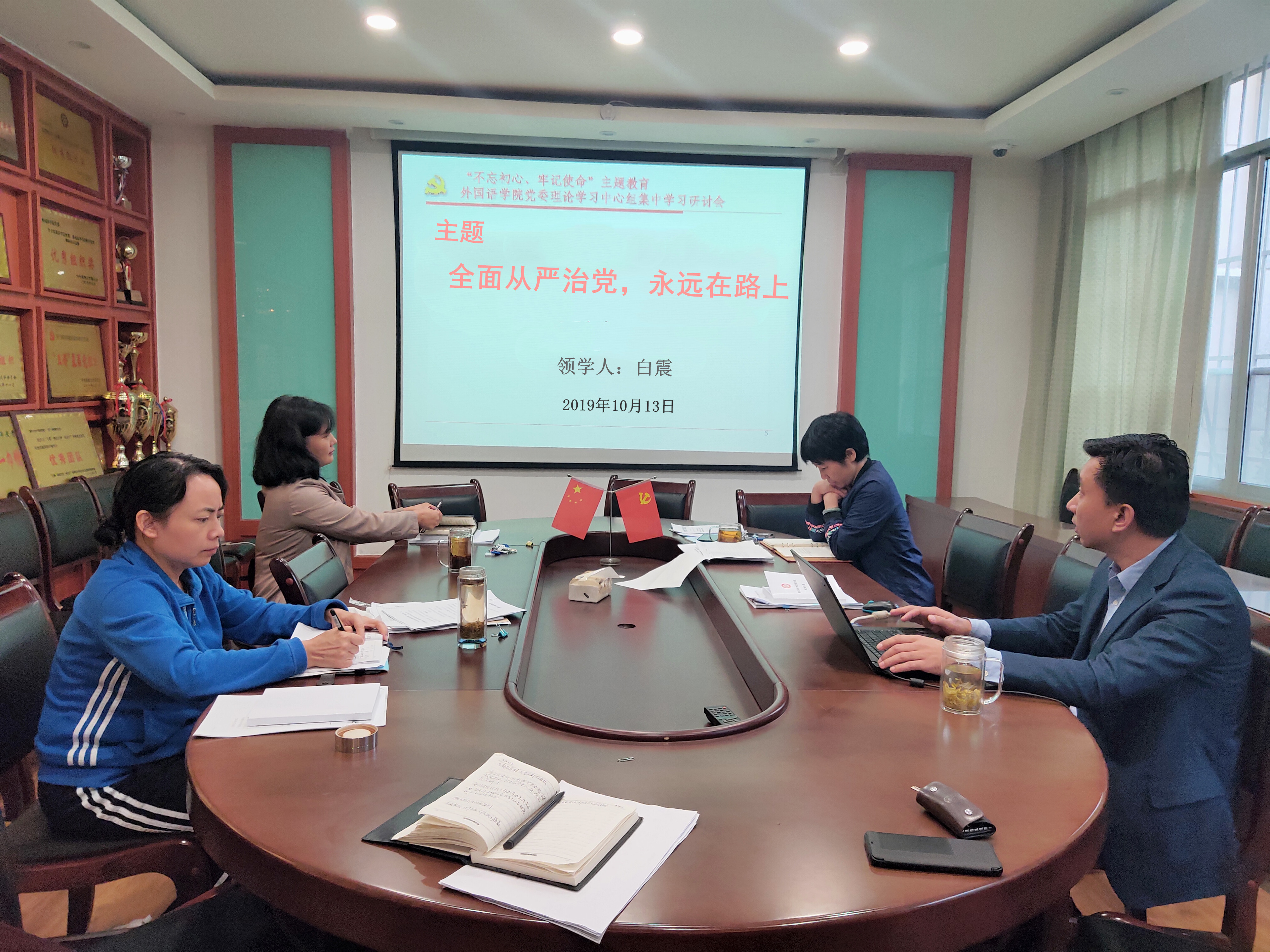 金沙9001cc以诚为本首页党政办讯 10月13日下午1:30,金沙官网党委在外语楼207会议室召开“不忘初心、牢记使命”主题教育第二次集中学习研讨会。学院党委书记白震、院长周杰、副院长宁梅、王晓梅参加了学习会。白震书记以“全面从严治党永远在路上,深刻领会全面从严治党的基本要求和重大意义”为题领学了本次集中学习研讨会。