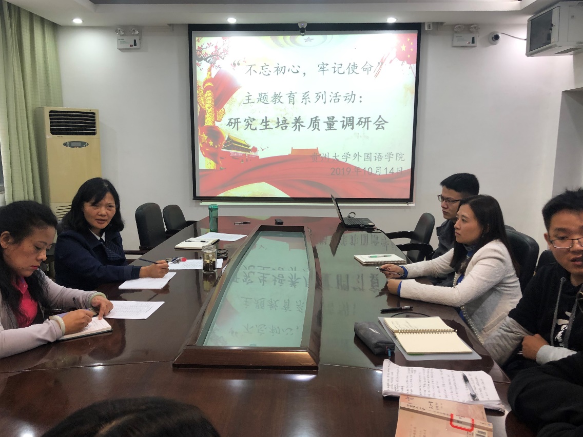 金沙9001cc以诚为本首页研究生科讯 2019年10月14日,金沙官网“不忘初心,牢记使命”主题教育研究生培养质量调研会在外院216会议室顺利召开。学院副院长王晓梅、研究生科科长王劫丹、研究生科副科长闻晓红及各研究生班级代表、研究生会代表、研究生党支部党员代表和团总支代表参加了本次调研会。