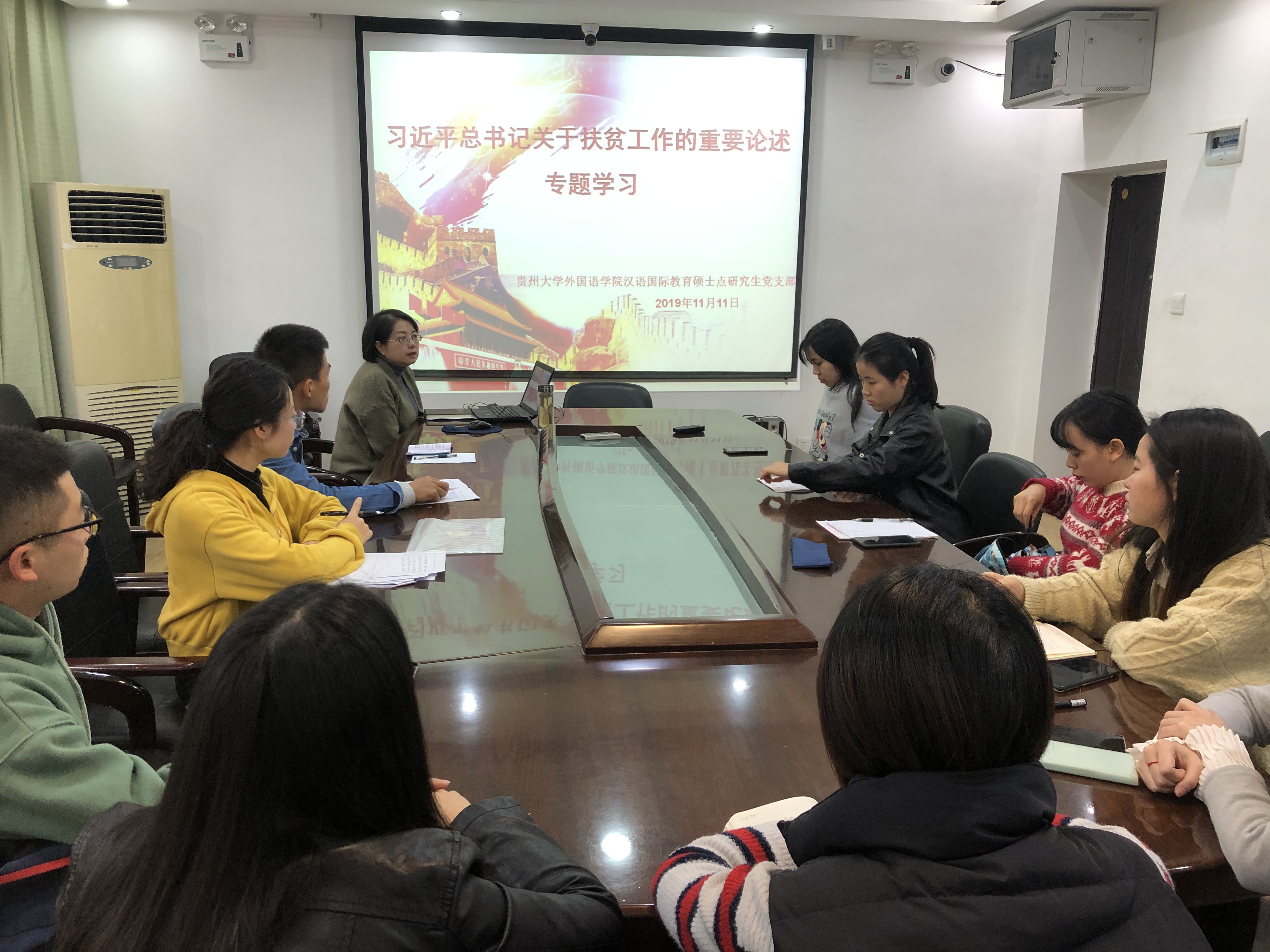 金沙9001cc以诚为本首页讯 2019年11月11日下午,我院汉语国际教育硕士点研究生党支部在外语楼216会议室召开“不忘初心、牢记使命”主题教育理论学习及党员座谈会,支部书记王劫丹主持会议。