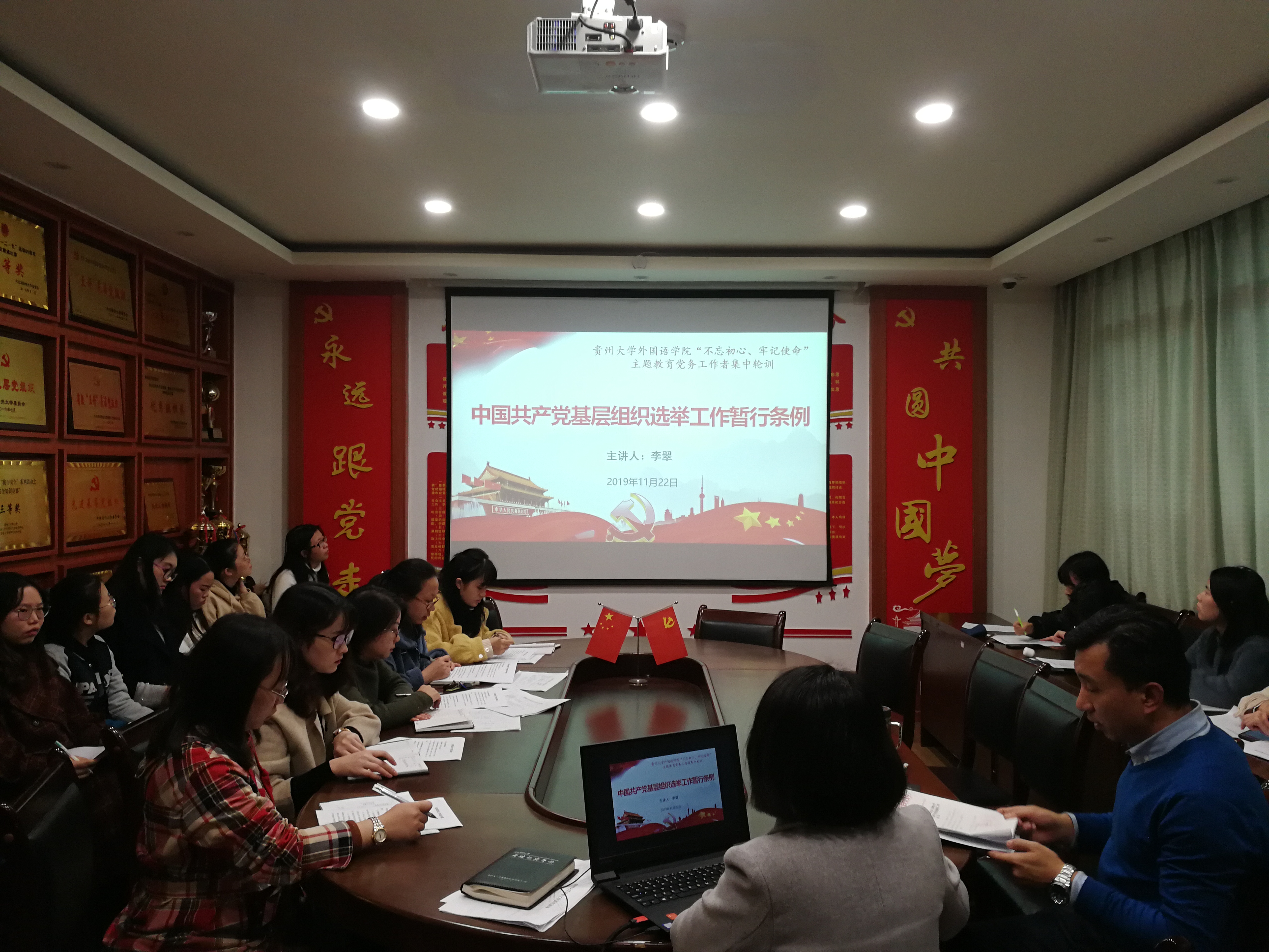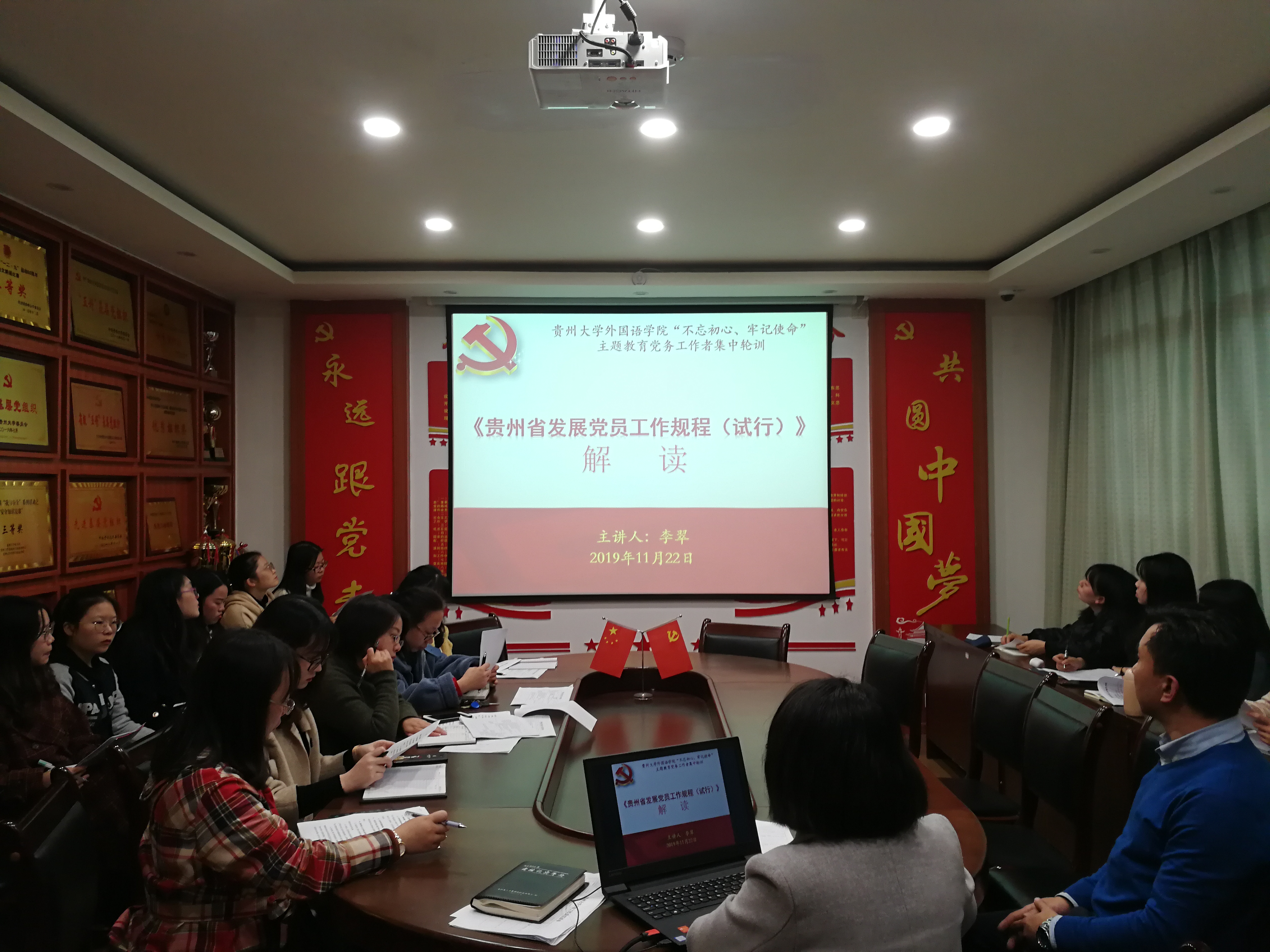 金沙9001cc以诚为本首页党政办讯 2019年11月22日下午, 我院“不忘初心、牢记使命”主题教育党务工作者集中轮训第三次培训在外语楼207党员活动室开展,学院党委书记白震出席培训会,学院各党支部书记及支委参加了培训。本次培训学习由学院机关党支部书记李翠主讲,主讲内容为《中国共产党基层组织选举工作暂行条例》及《贵州省发展党员工作规程(试行)》。