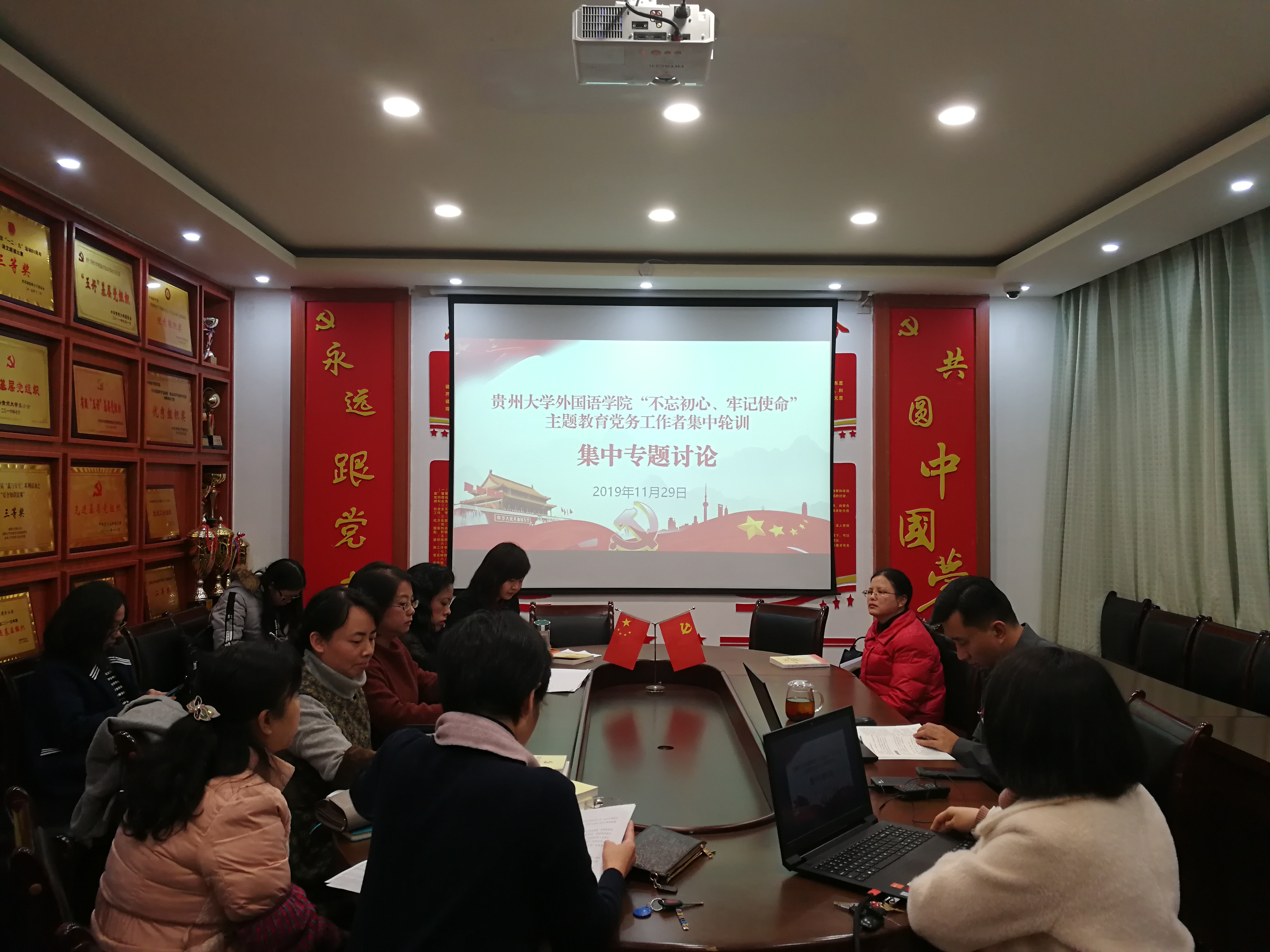 金沙9001cc以诚为本首页党政办讯 2019年11月29日下午,我院“不忘初心、牢记使命”主题教育党务工作者集中轮训第四次培训暨集中专题讨论在外语楼207党员活动室开展,学院党委书记白震、院长周杰、副院长宁梅出席培训会,学院各组织员、党支部书记及副书记参加了培训。本次培训学习由周杰院长主讲,主讲内容为党的十九届四中全会精神。