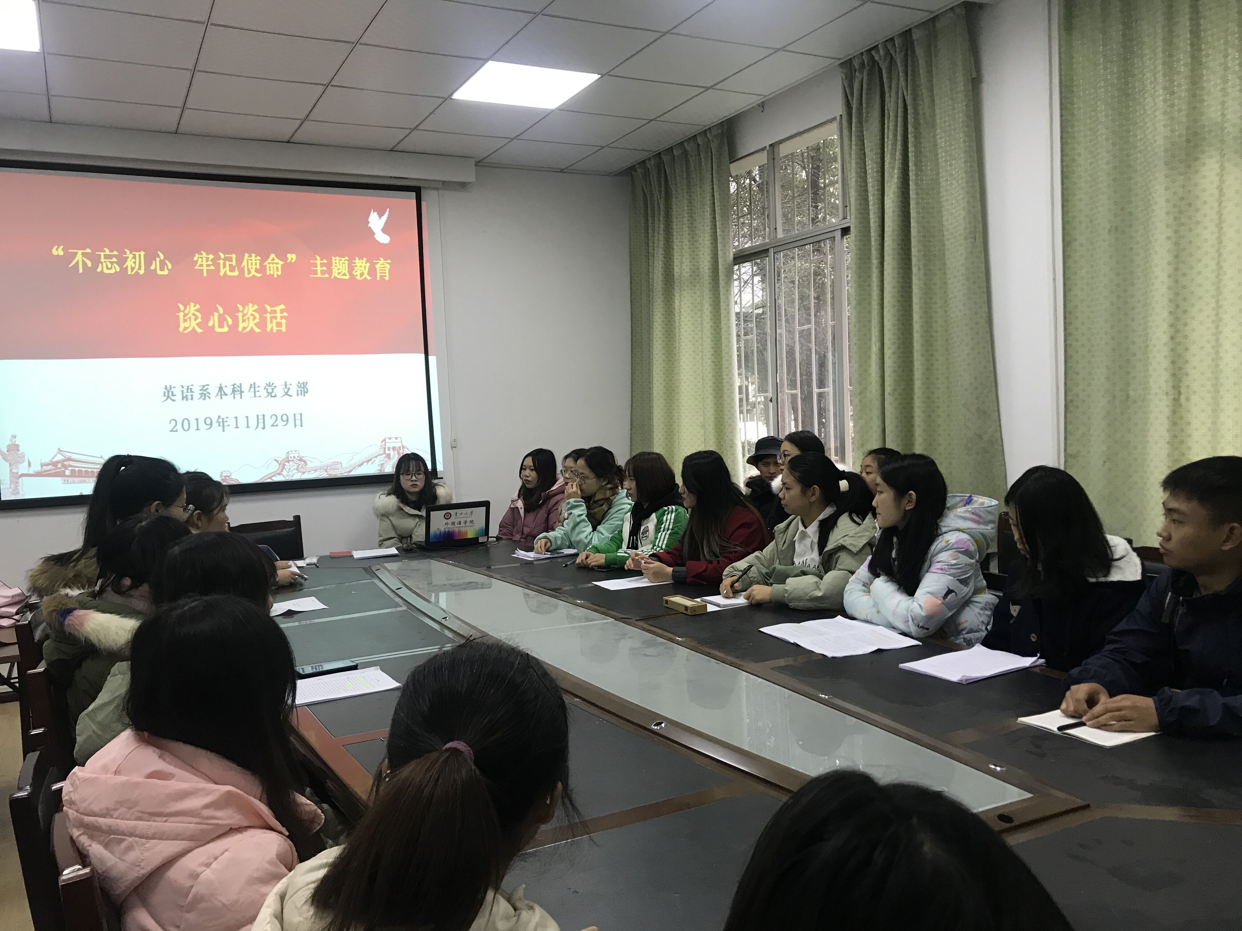 金沙9001cc以诚为本首页讯 11月29日下午,金沙官网英语系本科生党支部“不忘初心、牢记使命”主题教育谈心谈话在外语楼102会议室进行。英语系本科生党支部党员、第十期发展对象参加谈心谈话会,会议由英语系本科生党支部书记韦伊主持。