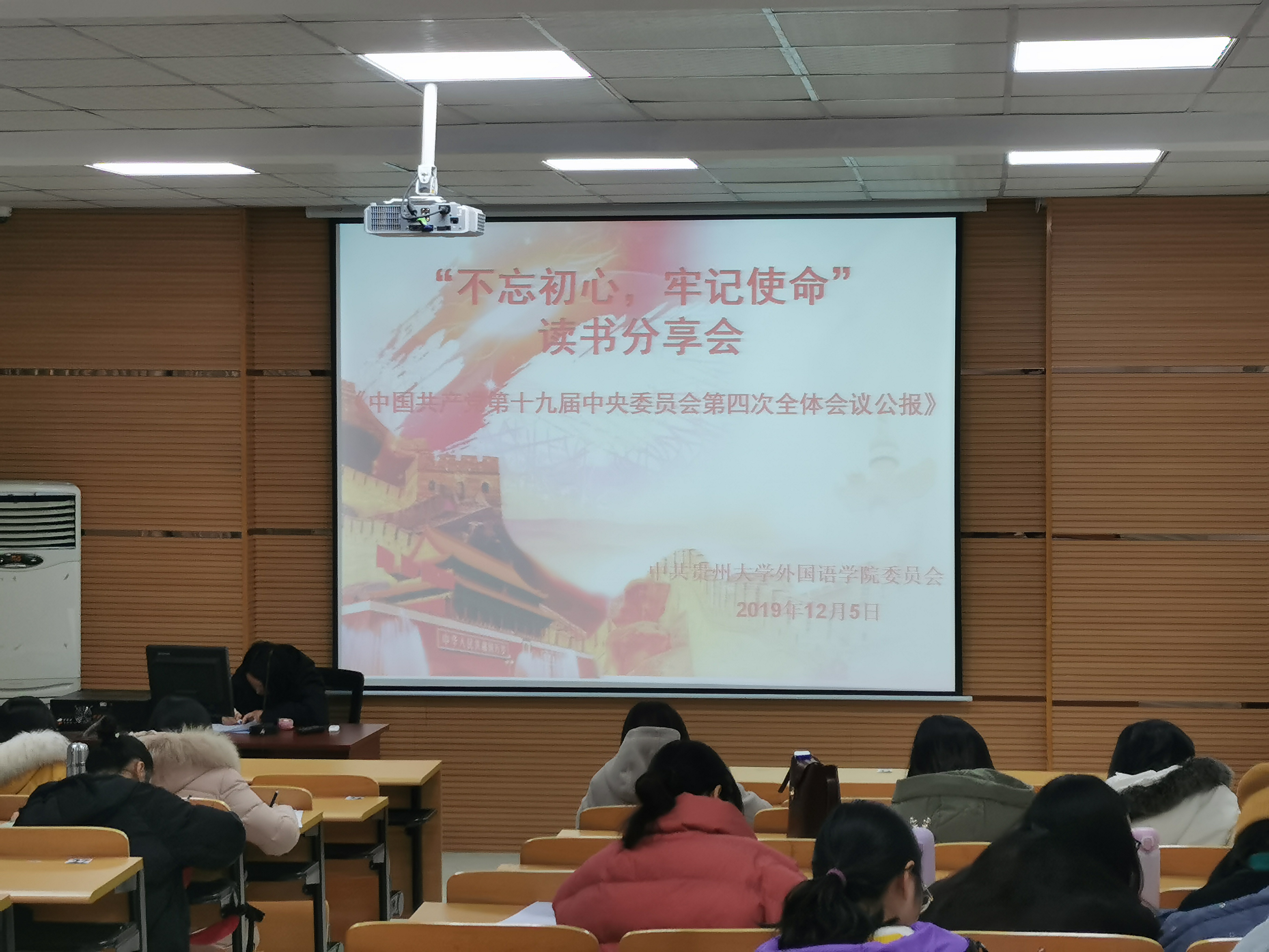金沙9001cc以诚为本首页讯 2019年12月5日晚7:00,金沙9001cc以诚为本首页党委组织学生党支部开展了“不忘初心、牢记使命”主题教育读书分享会,主要内容为学习《中国共产党第十九届中央委员会第四次全体会议公报》,学院本科生和研究生党支部共60名学生党员积极参与了此次学习会。