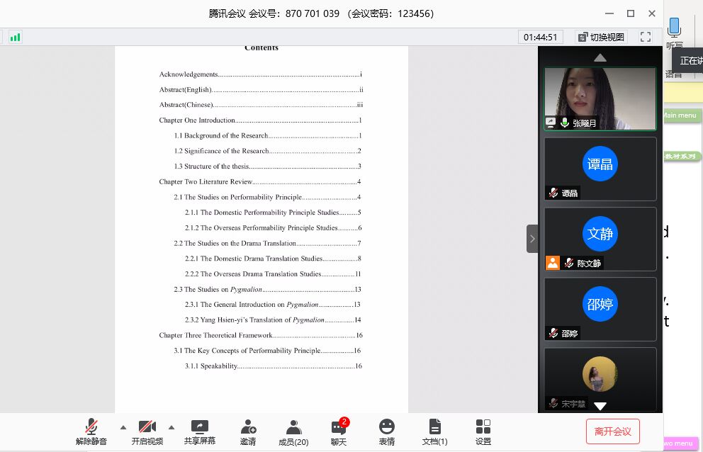 金沙9001cc以诚为本首页教学科讯 2020年5月8日,金沙9001cc以诚为本首页2016级本科生毕业论文中期答辩在以腾讯会议的方式举行。此次论文远程中期答辩共分为20个答辩小组,毕业论文指导老师、2016级本科生及教学科工作人员共同参与了答辩。