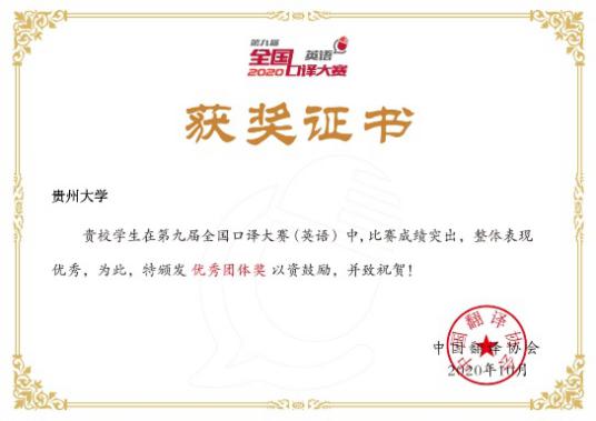 由于金沙官网学生在大赛中比赛成绩突出,整体表现优秀,荣获中国翻译协会颁发的优秀团体奖。聂晓霞老师荣获优秀领队奖。