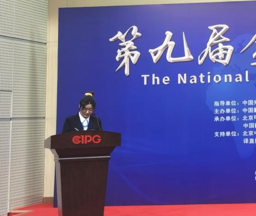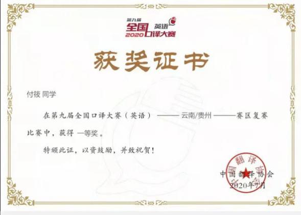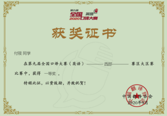 第九届全国口译大赛是由中国外文局指导,中国翻译协会主办的全国性翻译大赛。大赛共吸引来自全国各省市及港澳台地区500多所高校的近万名优秀选手参加。付筱同学在复赛(云南/贵州赛区)和西部大区赛中均获得一等奖,从而获得全国总决赛参赛资格,与全国51位优秀选手同台竞技,最终获得三等奖的优异成绩。