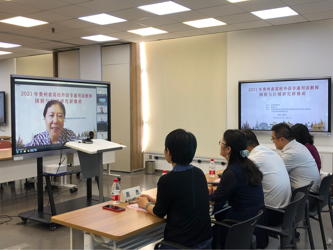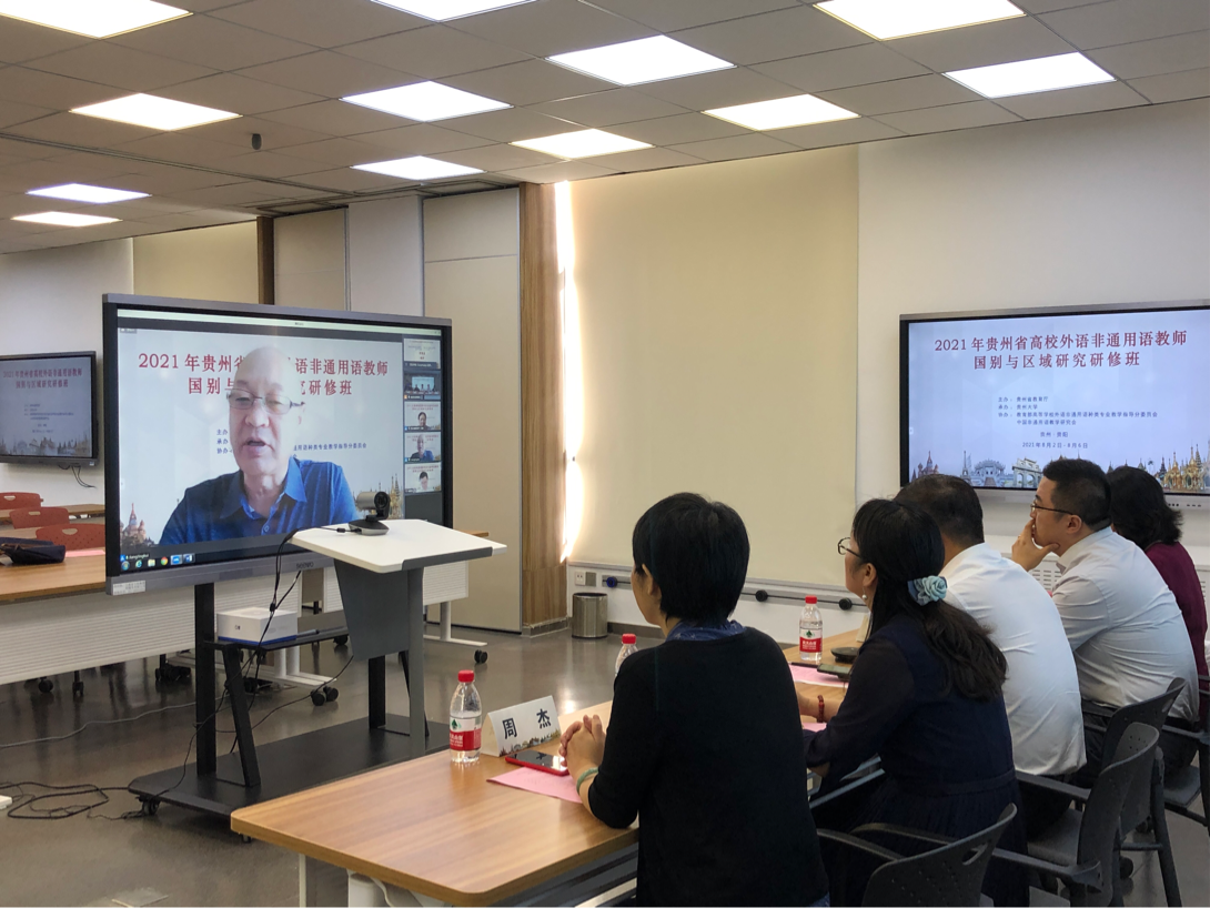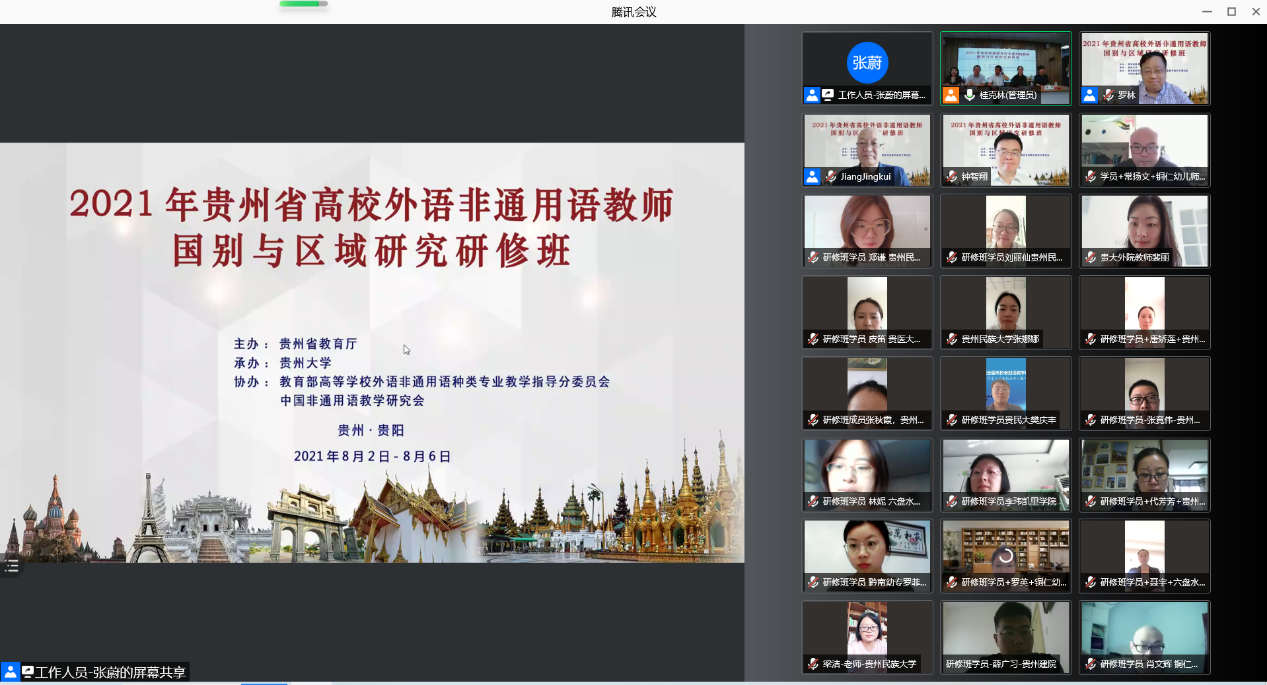 龙汶作开场介绍。2021年贵州省高校外语非通用语教师国别与区域研究研修班由贵州省教育厅主办,教育部高等学校非通用语种类专业教学指导分委员会、中国非通用语教学研究会协办,金沙9001cc以诚为本首页承办,本次研修班以“国别与区域研究”为主题。受新冠疫情影响,由原计划线下研修模式转为全程线上模式进行。时间从8月2日到6日,为期5天,涵盖共10个线上讲座和问答交流。