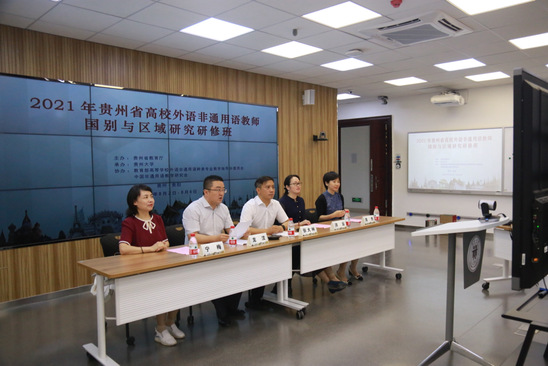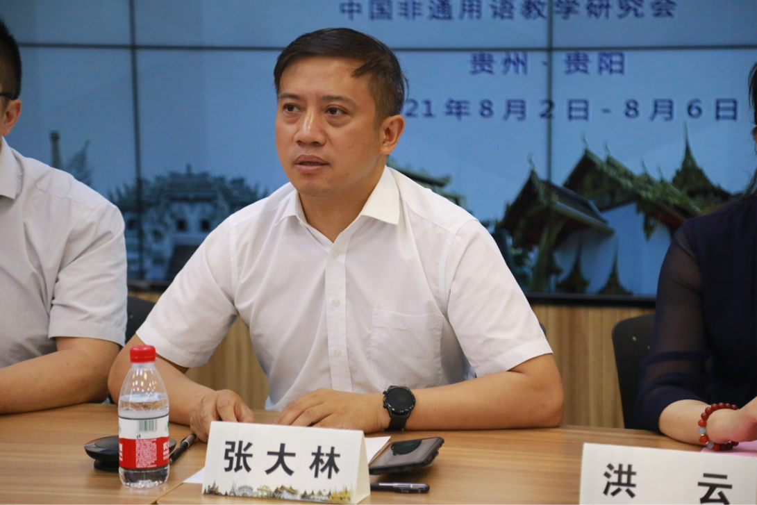 8月2日上午,2021年贵州省高校外语非通用语教师国别与区域研究研修班开班典礼在金沙9001cc以诚为本首页西校区德正楼221智慧教室顺利举行。贵州省教育厅党组成员、省教育工会主席、中国东盟教育交流周组委会副秘书长王慧,金沙9001cc以诚为本首页副校长张大林,教育部国别与区域研究工作秘书处主任、外指委副主任委员、阿拉伯语分指委主任委员、北京语言大学教授、博士生导师罗林,教育部外指委副主任委员、非通用语分指委主任委员、北京大学教授、博士生导师姜景奎,国务院外语学科评议组成员、教育部非通用语分指委副主任委员、信息工程大学教授、博士生导师钟智翔,中国-东盟教育交流周组委会秘书处办公室副主任陈文益,金沙9001cc以诚为本首页国际交流与合作处处长洪云、金沙9001cc以诚为本首页院长周杰、金沙9001cc以诚为本首页副院长宁梅出席本次开班典礼。仪式由金沙9001cc以诚为本首页党委书记龙汶主持。