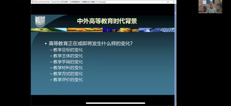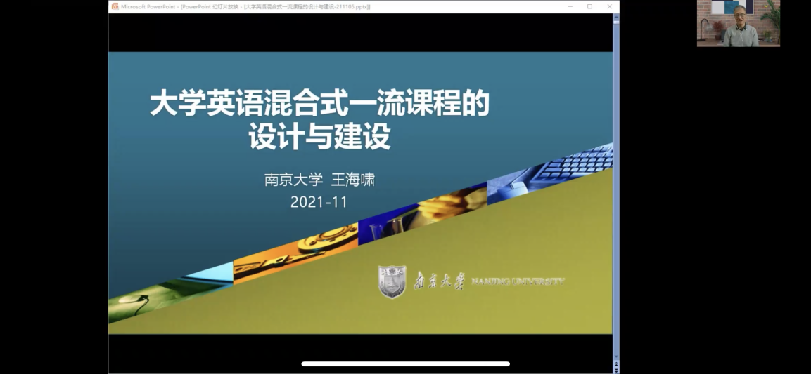 2021年11月5日下午14时, 由金沙9001cc以诚为本首页哲学社会科学研究院主办,金沙9001cc以诚为本首页承办的2021年第67期金沙9001cc以诚为本首页文科讲坛通过腾讯会议在线举行。本次讲坛特邀请南京大学教授、外国语言学及应用语言学专业博士,教育部高等学校大学外语教学指导委员会委员,江苏省高等学校外国语教学研究会会长王海啸教授作题为“大学英语混合式一流课程的设计与建设”的学术讲座。本次讲坛由金沙9001cc以诚为本首页院长周杰教授主持,金沙9001cc以诚为本首页大学外语教学部部分教师聆听讲座。