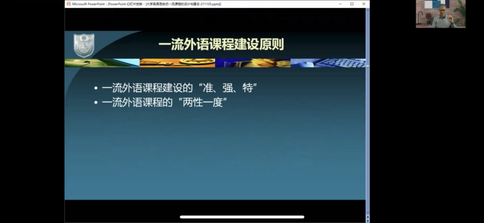 其次,王教授结合教育部关于一流本科课程建设的实施意见,讲解了一流外语课程建设的一些基本原则,如坚持分类建设、坚持扶强建设、提升高阶性、突出创新性、增加挑战度等,并引用习近平总书记的讲话,强调外语课程建设要想国家之所想、急国家之所急、应国家之所需,坚持把立德树人作为根本任务,做准、做强、做特,着力培养担当民族复兴大任的时代新人。