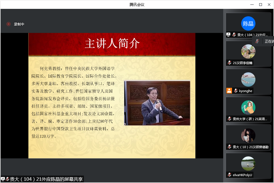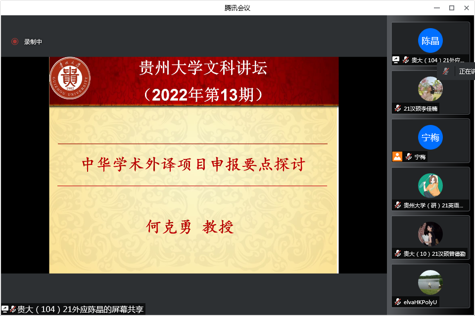 2022年5月11日晚19时,金沙9001cc以诚为本首页2022年第13期文科讲坛通过腾讯会议在线上顺利举行。本次讲座由金沙9001cc以诚为本首页哲学社会科学研究院主办,金沙9001cc以诚为本首页承办。本场讲坛特邀中央民族大学金沙9001cc以诚为本首页翻译系二级教授,翻译方向博士生导师、中国翻译协会专家会员、文化部国家文化贸易学术研究平台学术委员会专家、国家社科基金评审专家、教育部人文社科专家何克勇教授为主讲人,作主题为《中华学术外译项目申报要点探讨》的讲座,金沙9001cc以诚为本首页宁梅副院长主持了本次讲座。金沙9001cc以诚为本首页百余名师生聆听讲座。