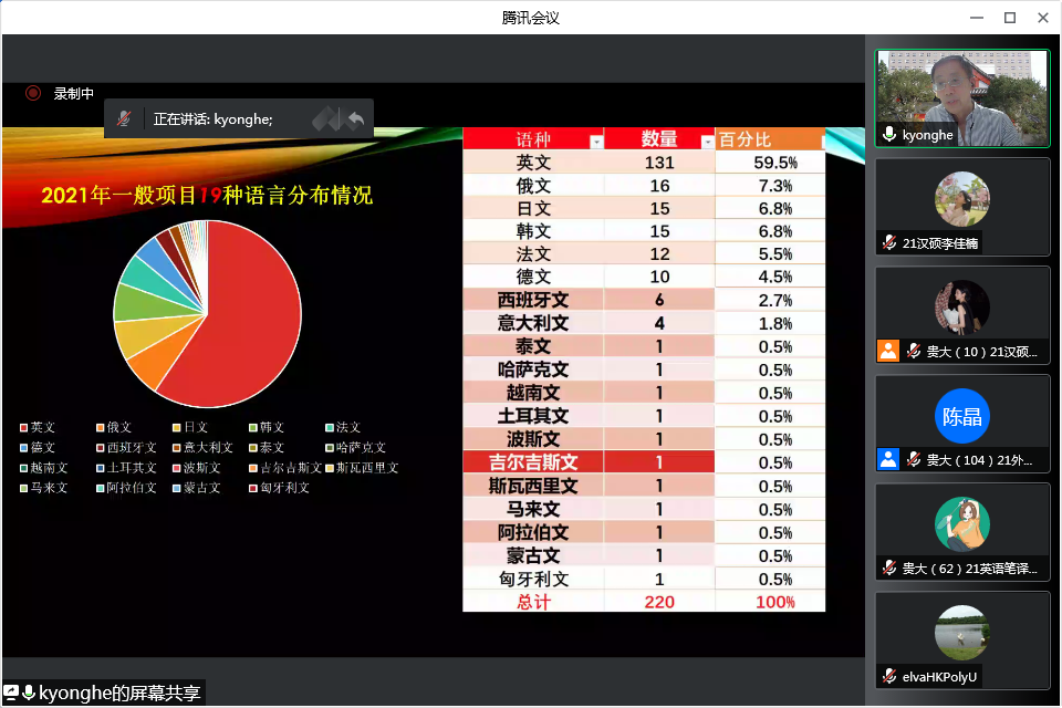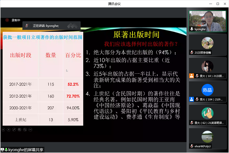 然后,何教授通过展示立项名单、获批一般项目立项著作的出版时间范围、2016-2021中华学术外译语种情况、著作来源的统计数据表格以及2021年一般项目19种语言分布情况的饼状图,分析了项目申报的实际情况,并根据以上研究得出7个问题,同时结合自身资源提出了4个问题。