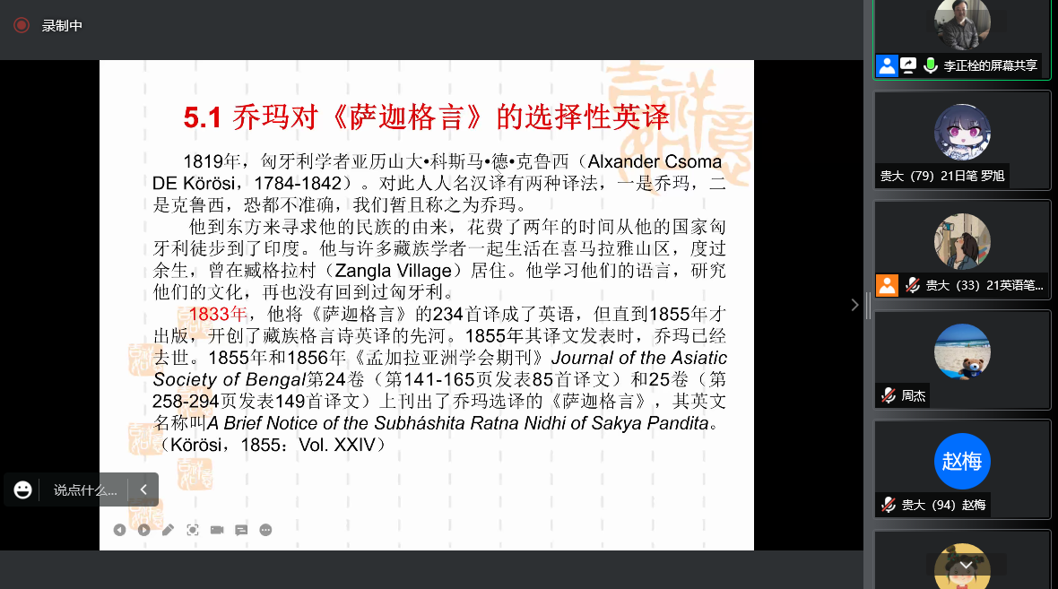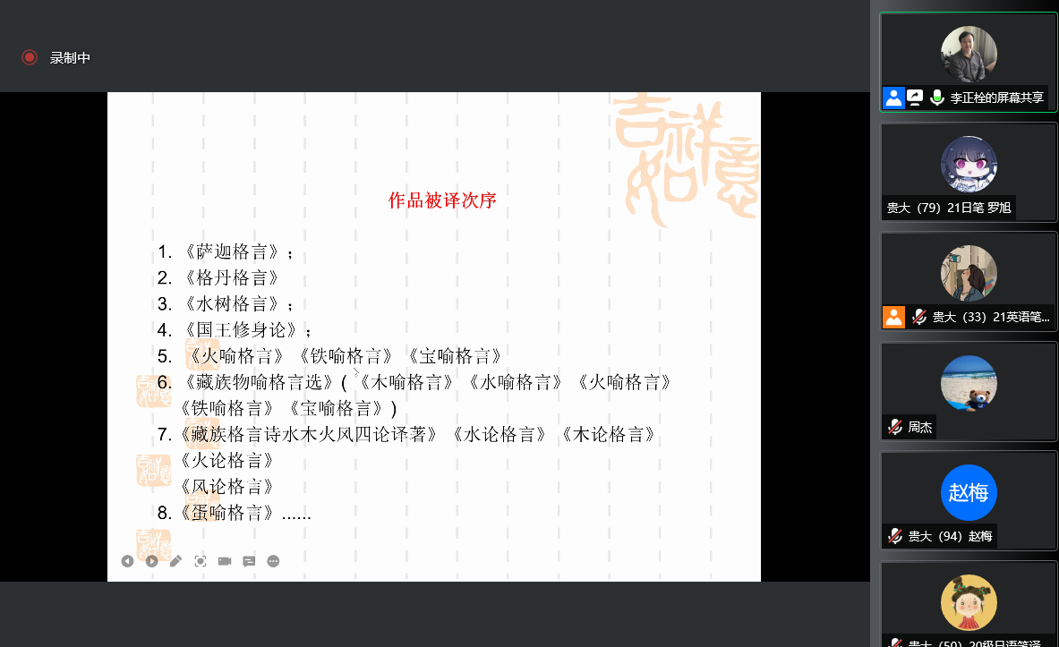 最后,李教授对藏族格言诗的外译出版情况进行了介绍,并表示,把独立的翻译现象总结成藏族格言诗翻译史,是我们当下需要完成的事情。