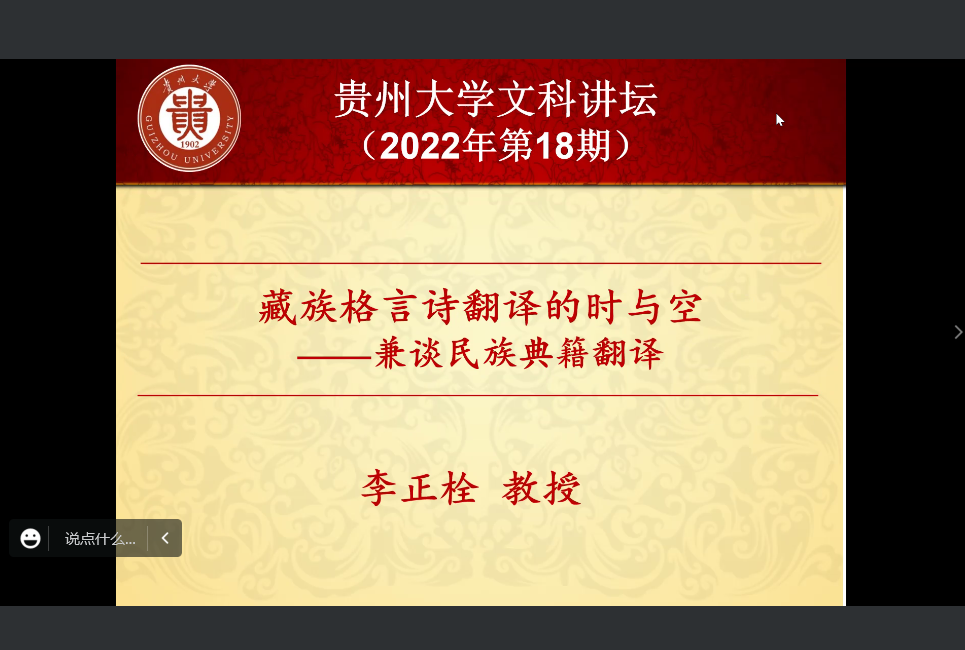 2022年5月30日晚上19时,由金沙9001cc以诚为本首页哲学社会科学研究院、金沙9001cc以诚为本首页承办的金沙9001cc以诚为本首页2022年第18期文科讲坛在云端举行。本次讲坛特邀河北师范大学金沙9001cc以诚为本首页博士生导师李正栓教授作题为“藏族格言诗翻译的时与空—兼谈民族典籍翻译”的学术讲座。讲座由金沙9001cc以诚为本首页院长周杰主持,金沙9001cc以诚为本首页百余名师生在线聆听本次讲座。