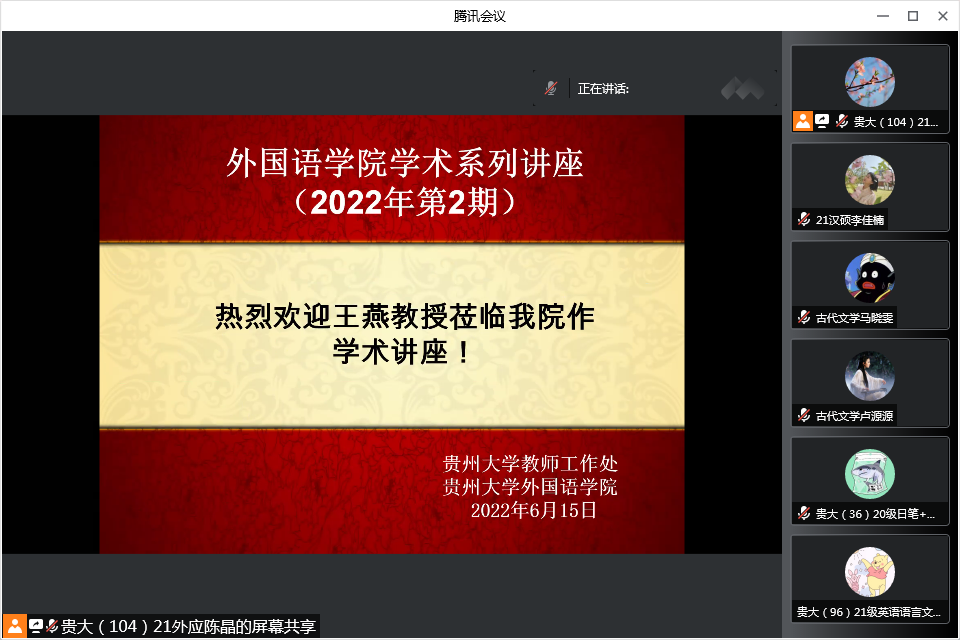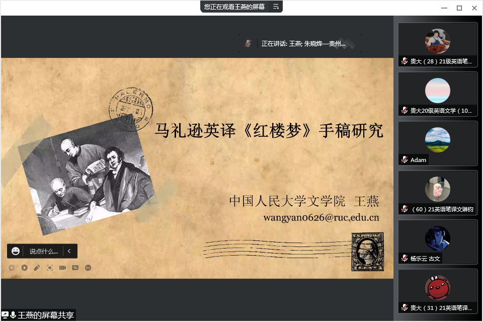 2022年6月15日晚19点,金沙9001cc以诚为本首页2022年第2期学术系列讲座通过腾讯会议在线上顺利举行。本次讲座特邀中国人民大学文学院王燕教授作题为“马礼逊英译《红楼梦》手稿研究”的讲座,讲座由金沙9001cc以诚为本首页朱晓烽副教授主持,全院150余名师生参加。