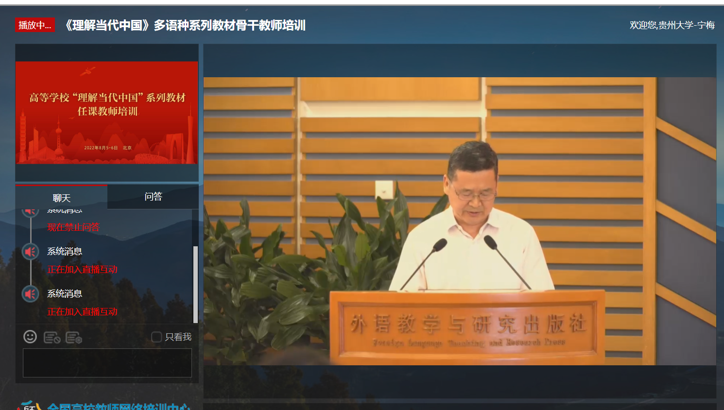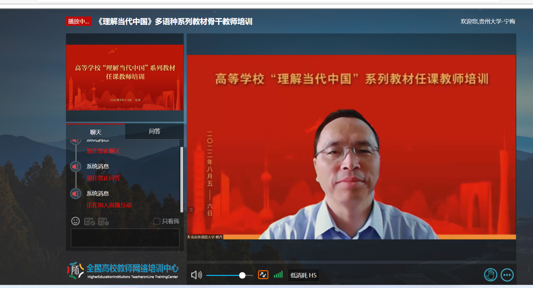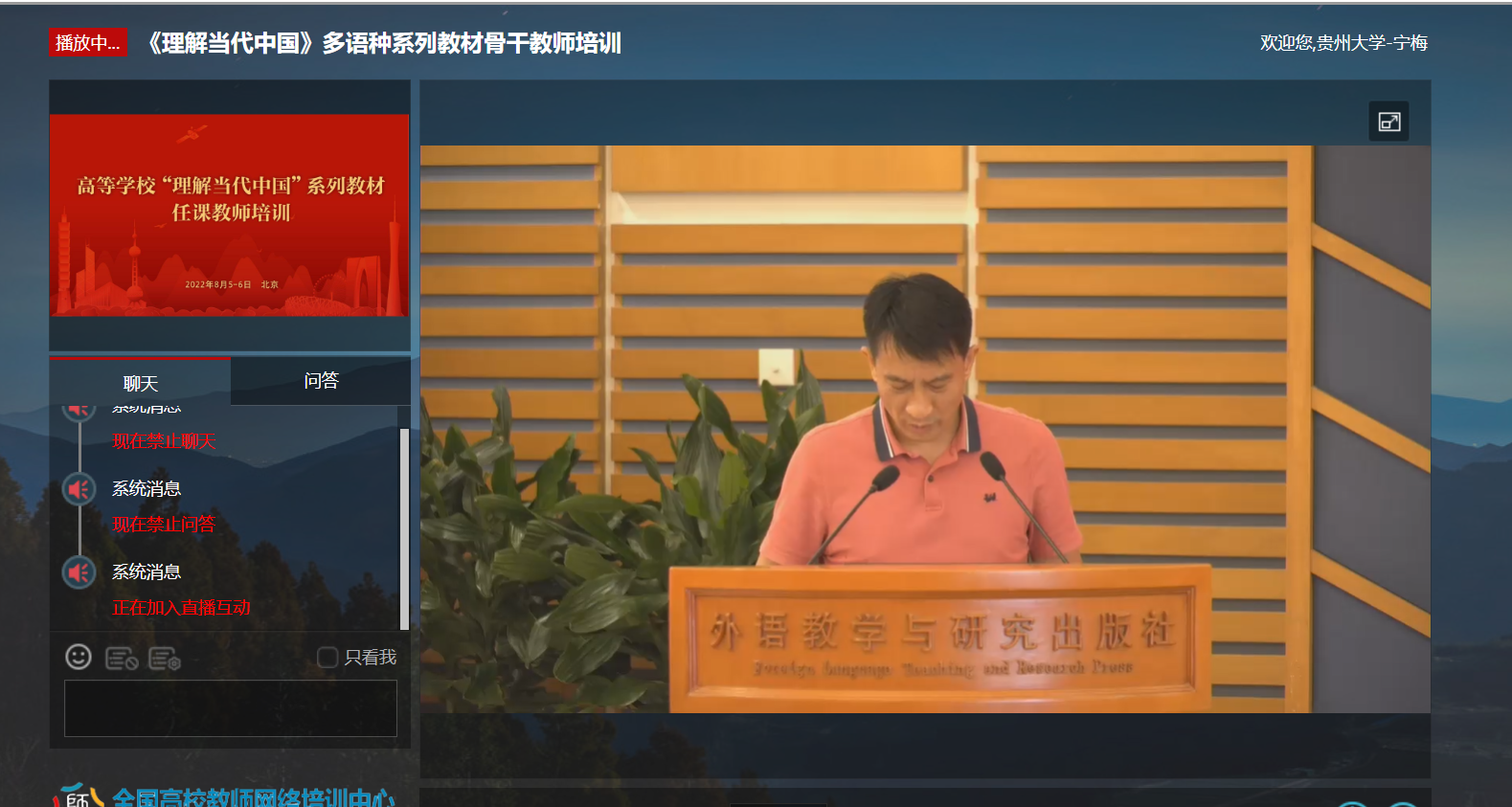2022年8月5日-6日,教育部高等教育司通过全国高校教师网络培训平台举办《理解当代中国》多语种系列教材任课教师专题培训,该系列教材由中央宣传部和教育部联合组织编写。学校教务处及金沙9001cc以诚为本首页党政负责人高度重视此次培训,学院领导,英语、日语、缅甸语专业系主任及各专业教师,各硕士点负责人及研究生导师等近百名教师参加了培训。8月5日,全体参训教师学习了习近平新时代中国特色社会主义思想专题培训和专题辅导。8月6日,各专业教师按语种分组参加了系列教材编写理念和教学示范培训。