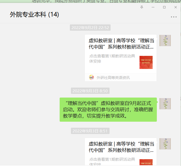 自开学以来,金沙官网不仅开展学院内部老师们的交流研讨,还克服疫情期间的种种困难,积极组织相关教师于2022年9月15日参加了国家首批虚拟教研室《理解当代中国:英语读写教程》虚拟教研室的课程研讨,北外专家教授分享教学计划和教学安排,北外副校长孙有中教授做了专门的课程教学的经验分享,深入细致,鞭辟入里,老师们反映这样的专家指引下的集体备课、线上研讨的方式非常有效,使她们收益良多。