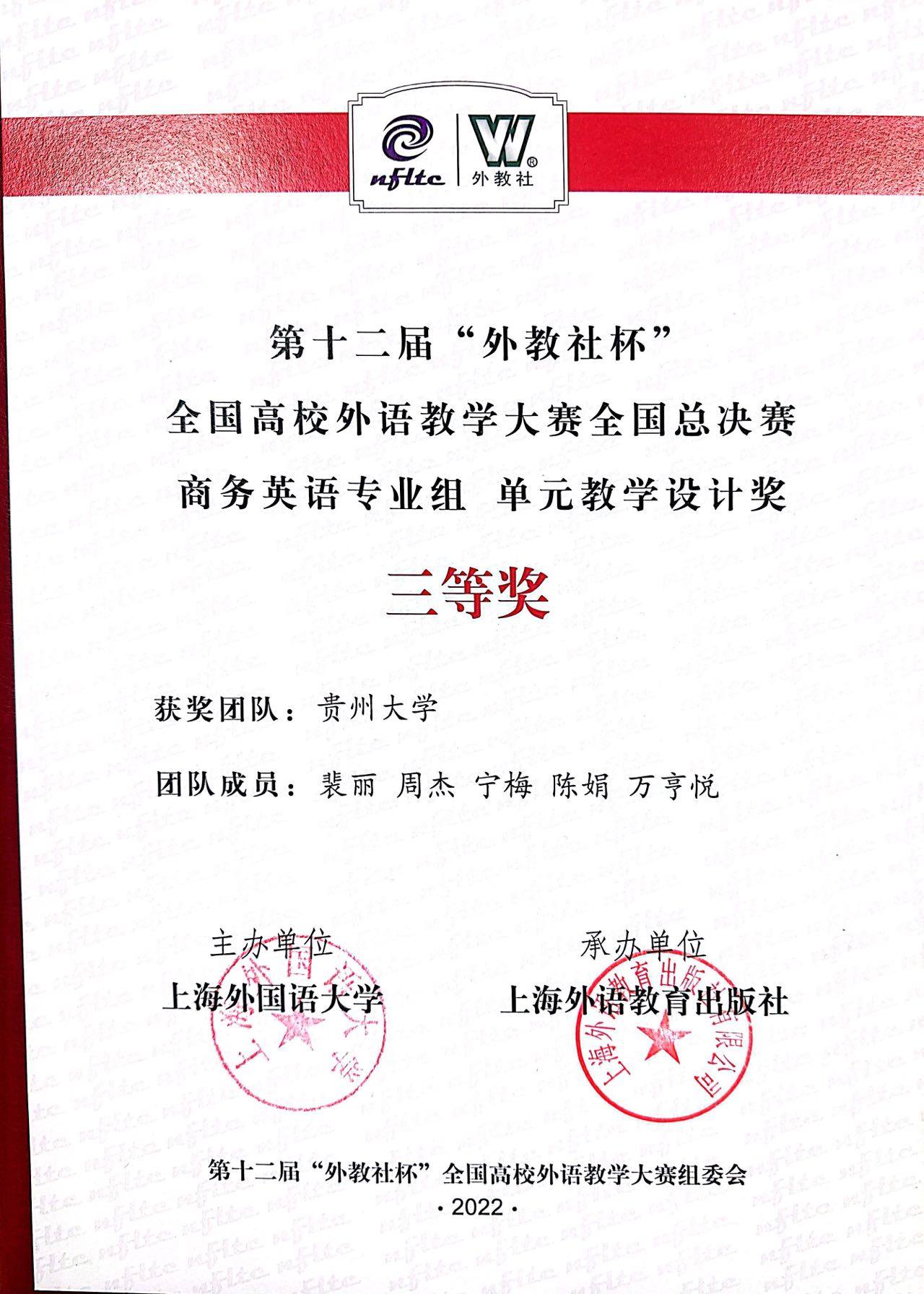 金沙9001cc以诚为本首页讯金沙官网商务英语系教师裴丽博士于2022年9月24日上午,代表贵州省参加了第十二届“外教社杯”全国高校外语教学大赛(专业)商务英语组的全国决赛并取得三等奖的优异成绩。