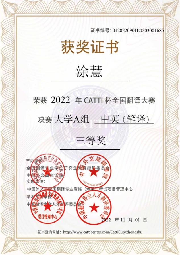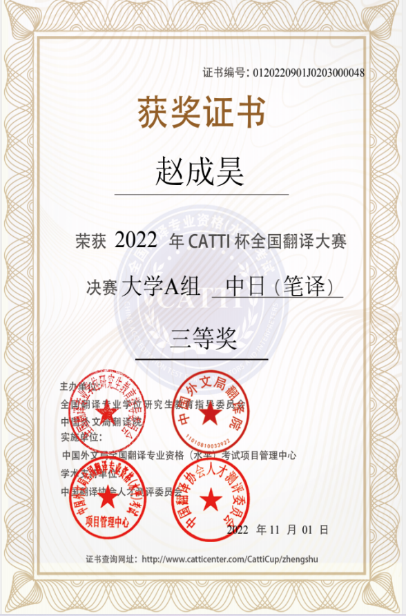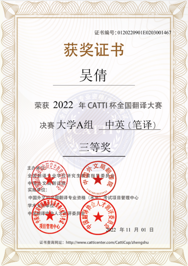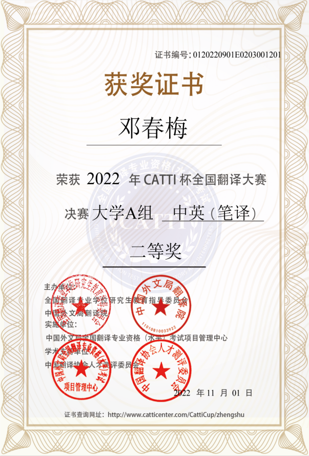 在10月底结束的2022年“CATTI杯”全国翻译大赛决赛中,金沙9001cc以诚为本首页学生表现优异,喜获佳绩,共有四名学生荣获奖项。英语专业本科生邓春梅同学荣获大学A组中英(笔译)二等奖,涂慧和吴倩同学荣获中英(笔译)三等奖。日语翻译专业研究生赵成昊荣获大学A组中日(笔译)三等奖。金沙9001cc以诚为本首页荣获优秀组织奖。