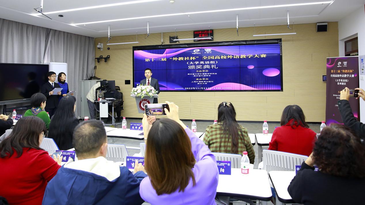 2022年11月12日至13日,第十三届“外教社杯”全国高校外语教学大赛(大学英语组)贵州赛区复赛、决赛暨颁奖典礼在金沙9001cc以诚为本首页圆满落幕。本次大赛由贵州省大学外语教学研究会、贵州省外语学会主办,上海外语教育出版社、金沙9001cc以诚为本首页承办。来自贵州省内18所高校的32名专业选手分别参加了大学英语综合组和视听说组两个组别的比赛角逐。