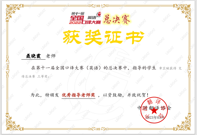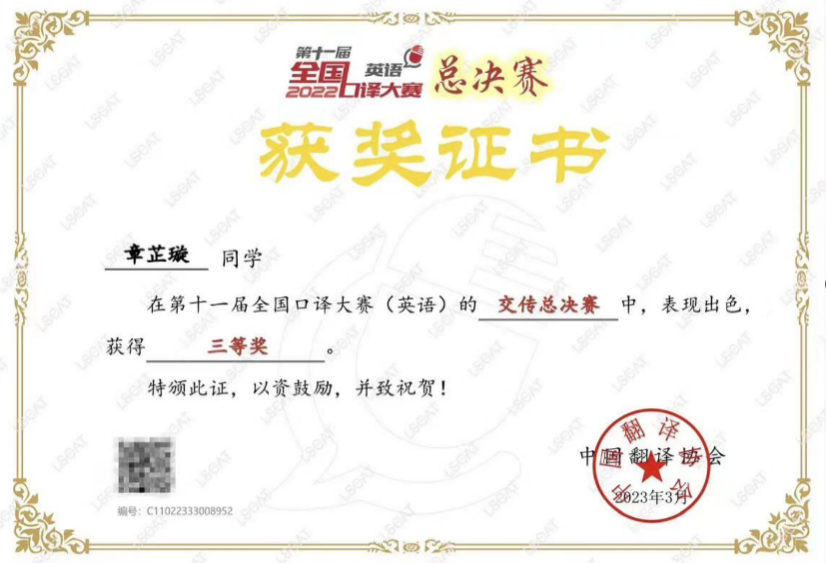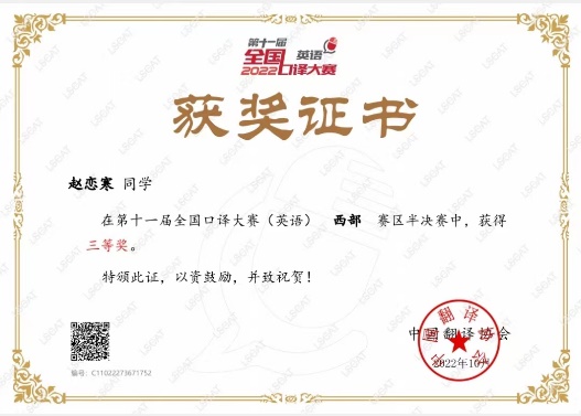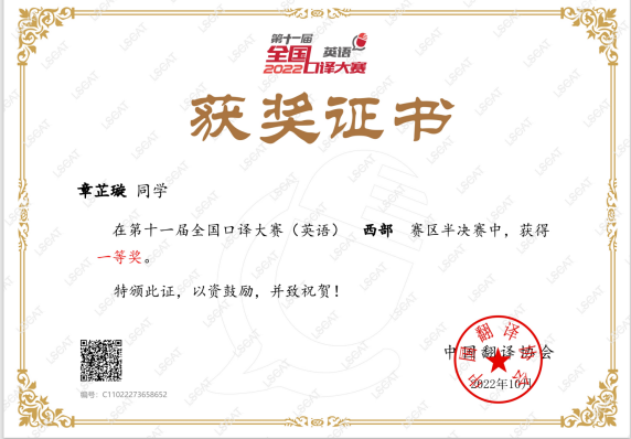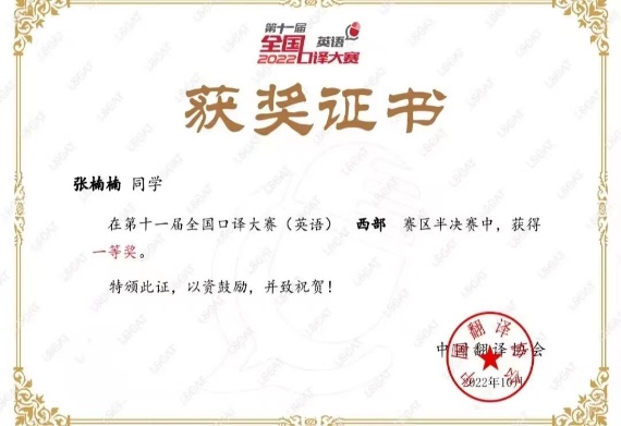 2023年3月,第十一届全国口译大赛总决赛结果揭晓。金沙官网学生在本次比赛中喜获佳绩:英语专业本科翻译方向19级学生章芷璇荣获英语交传组总决赛全国三等奖,继2020年付筱同学获得全国第九届口译总决赛三等奖后又一次获此优异成绩。